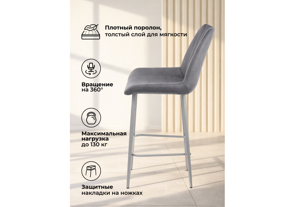 Материал каркаса - металл; Материал сиденья - велюр; Материал обивки - велюр; Цвет ножек - серый; Ширина - 49; Глубина - 57; Высота - 102; Ширина сиденья - 47; Глубина сиденья - 41; Высота сиденья - 63;