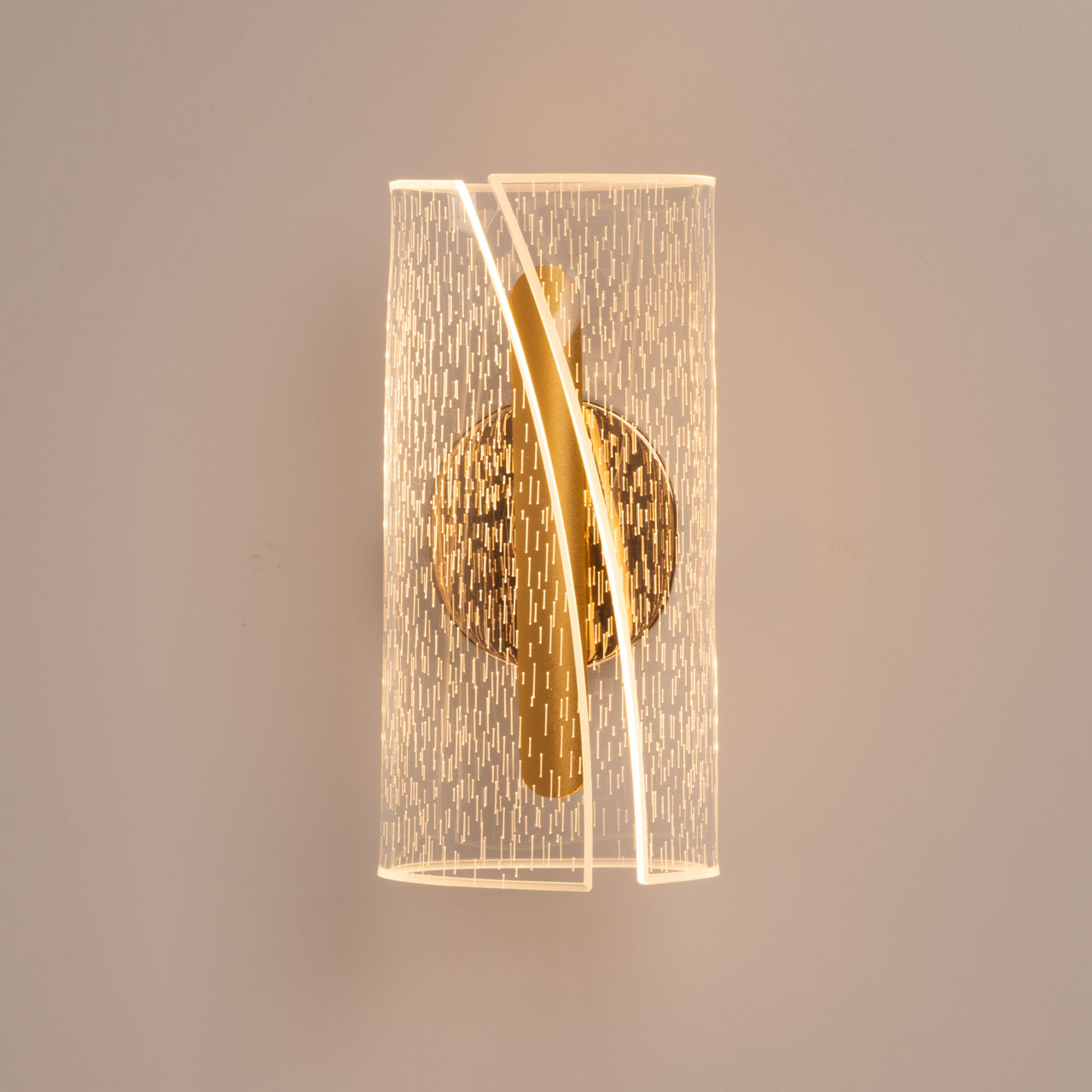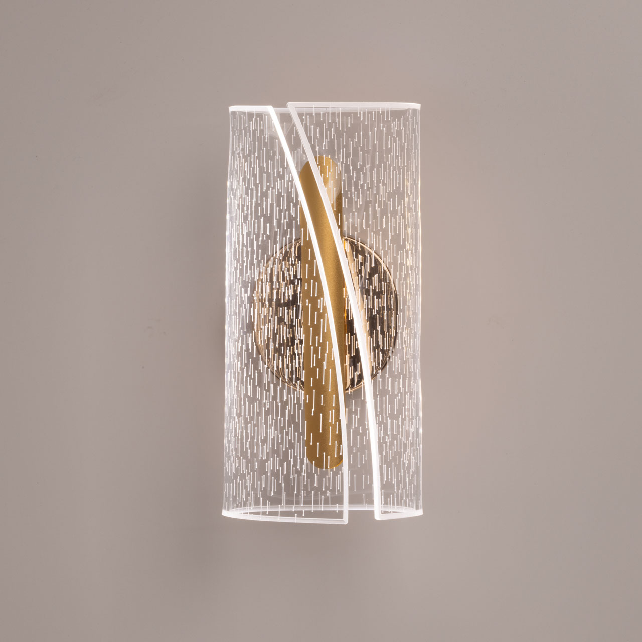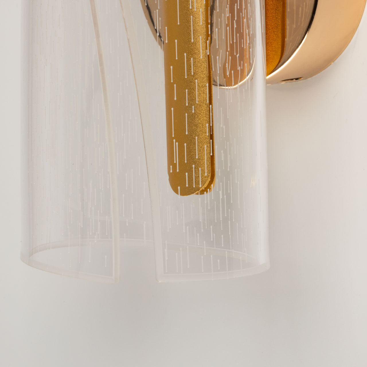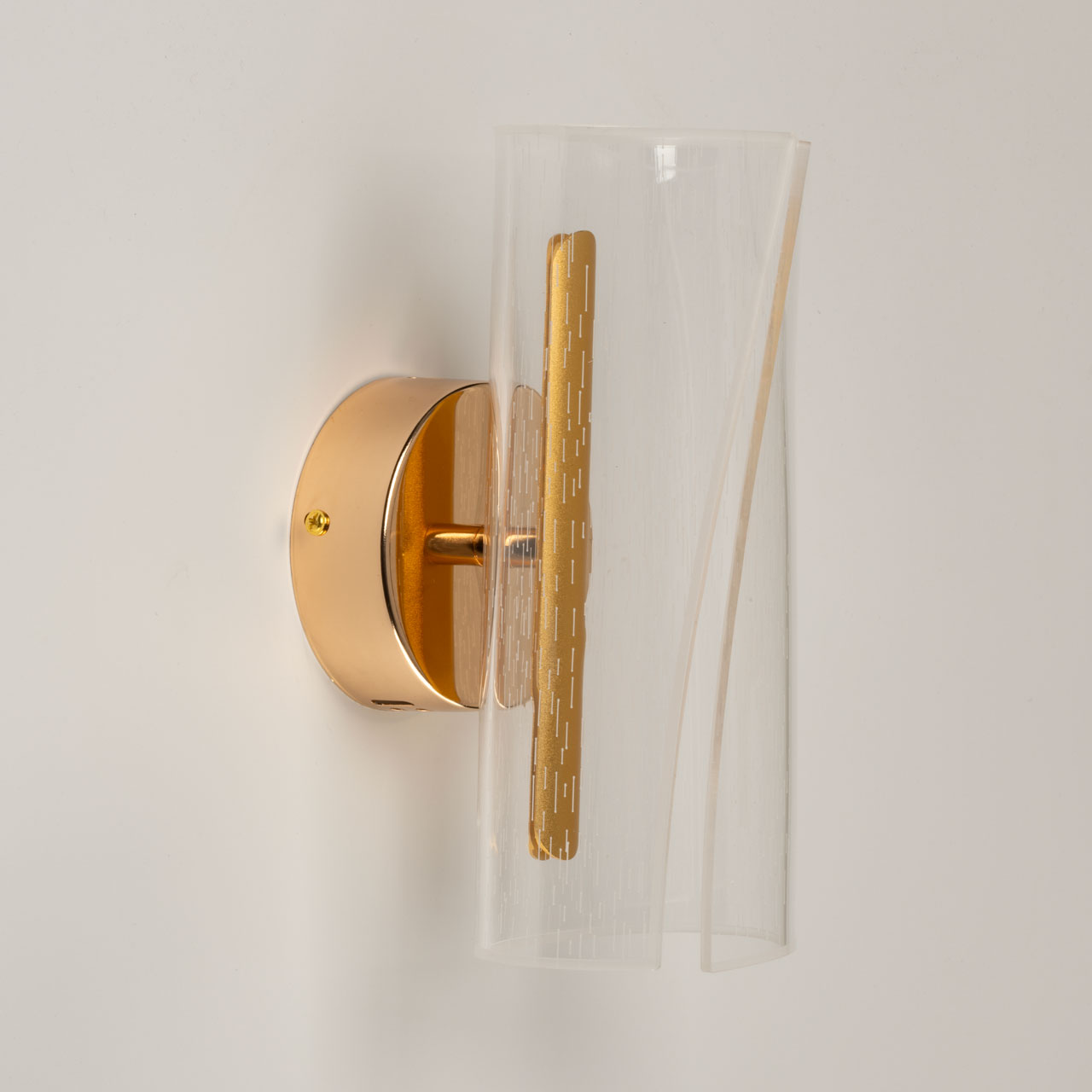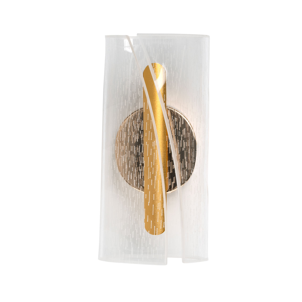 Металлический корпус настенного бра гальванизирован в цвет золота. Корпус плафона выполнен из сплава алюминия и окрашен в цвет золота. Настенное бра декорировано изящным элементом из прозрачного акрила с графичным рисунком.