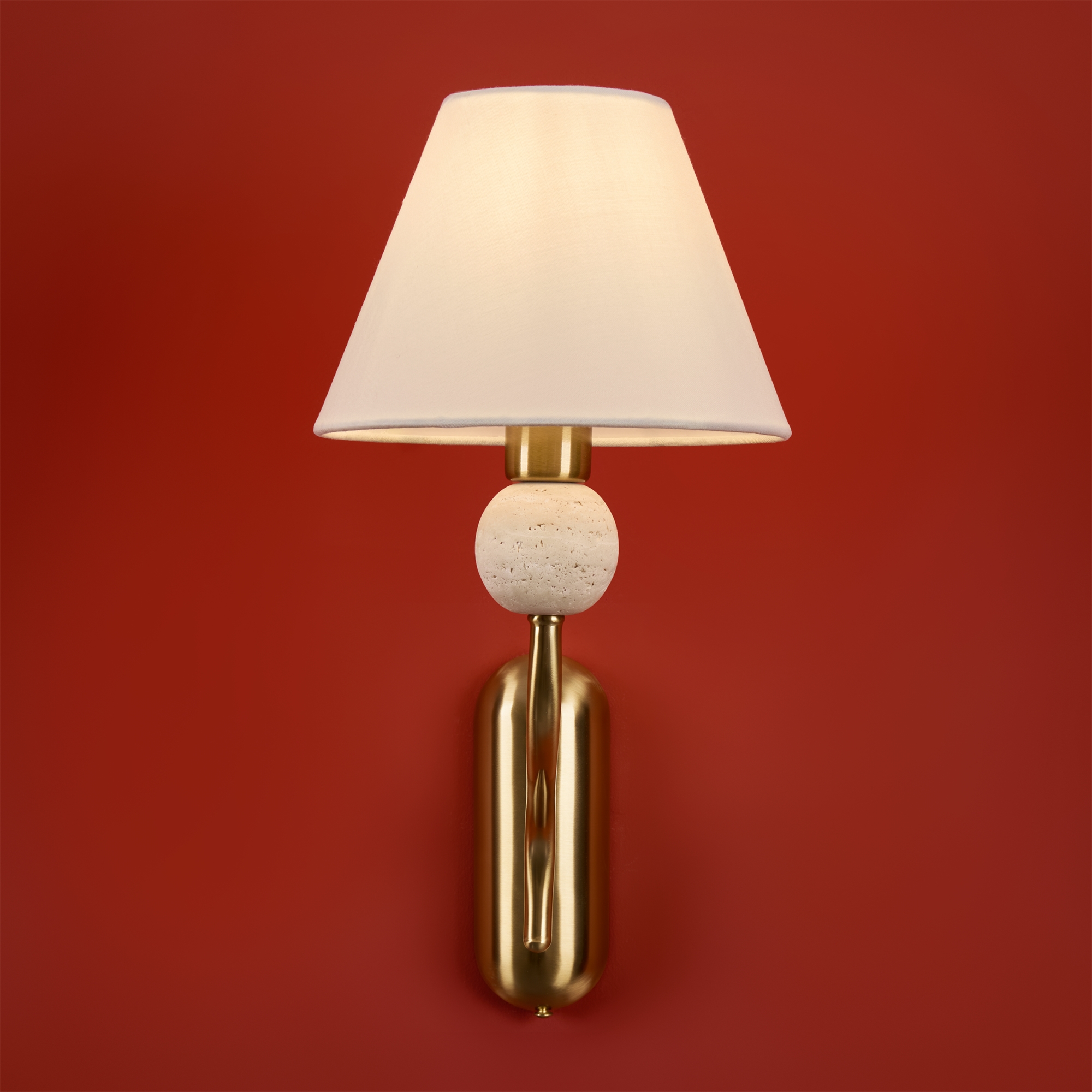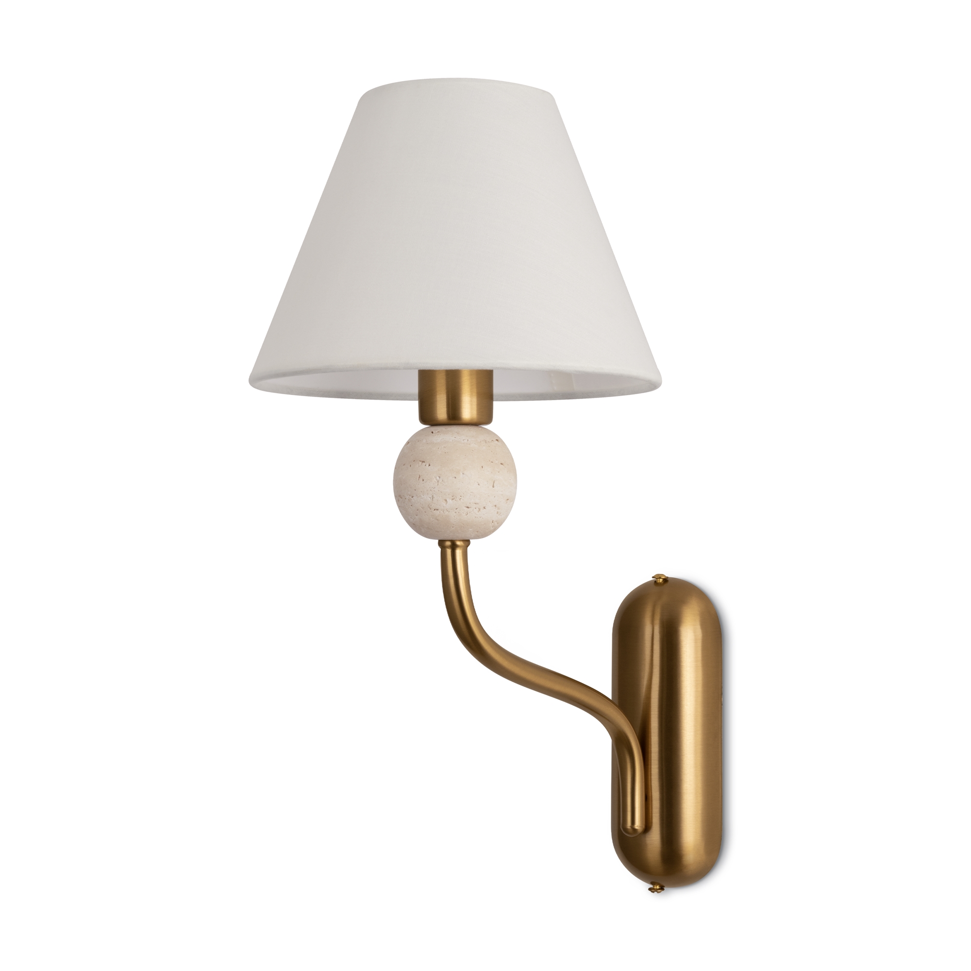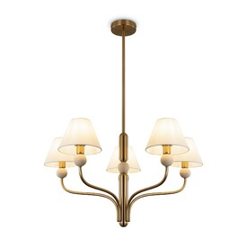 Арматура - металл в цвете латунь. Тканевые абажуры, травертиновые элементы. Лампы E14 (в комплекте). Серия состоит из люстры c 5 плафонами и бра. Трендовое сочетание в классическом стиле.
