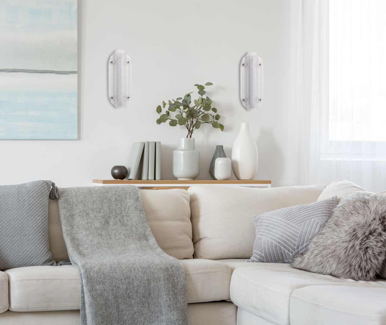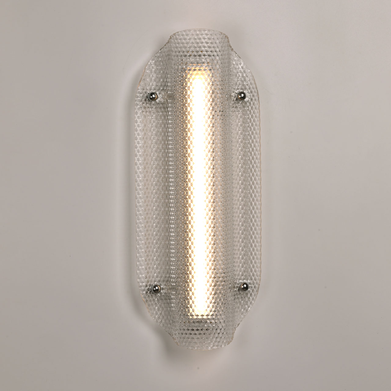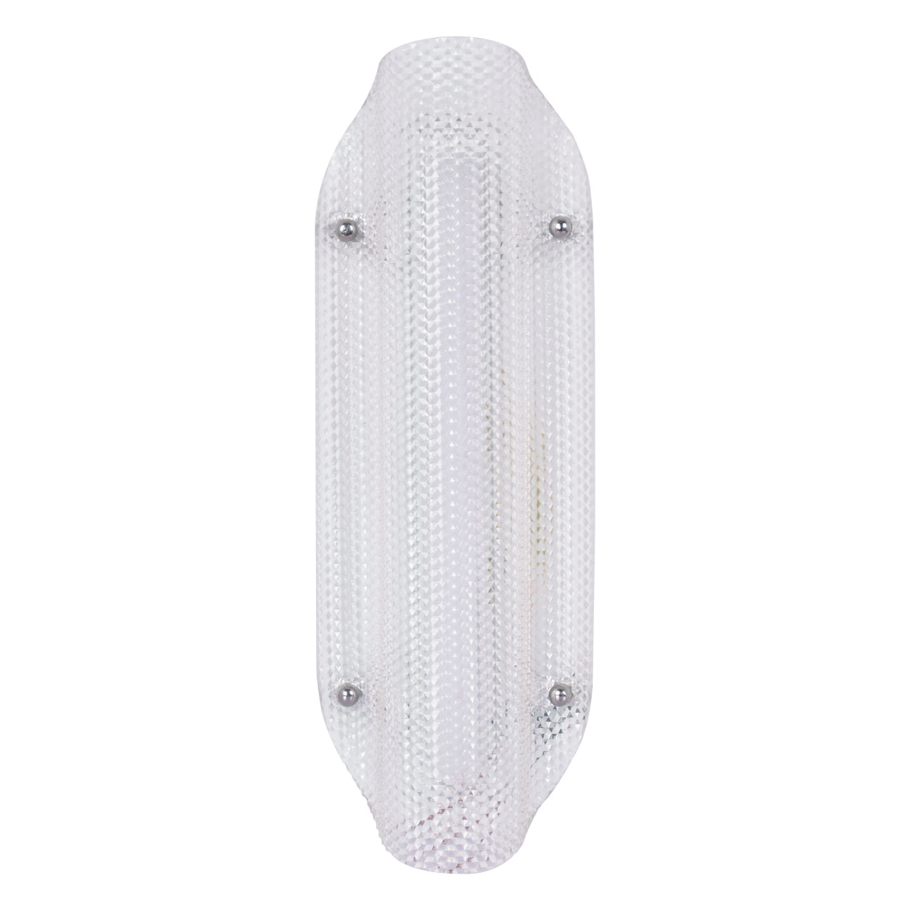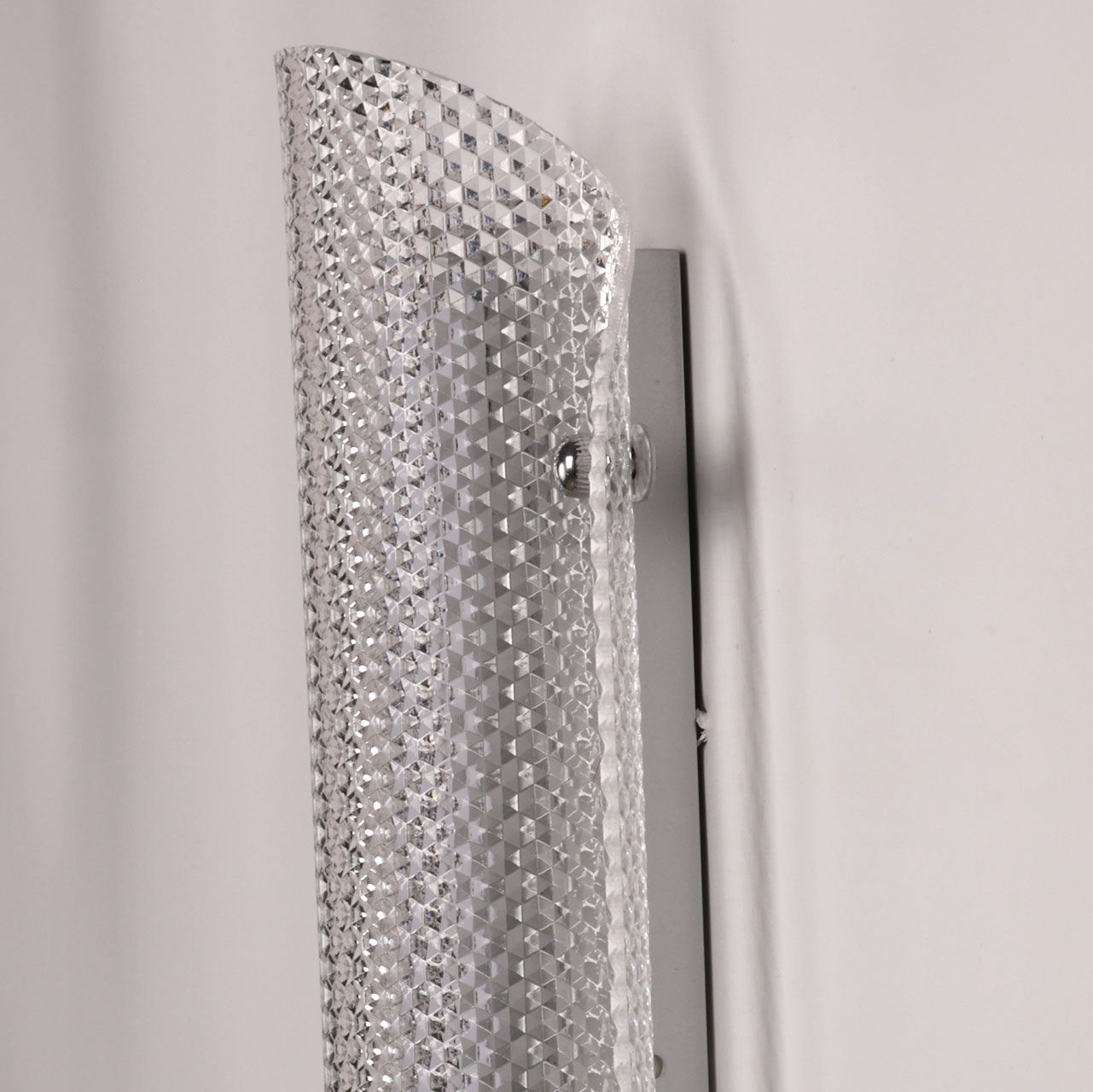 Металлическое основание настенного бра окрашено в цвет перламутрового серебра. Плафон выполнен из прозрачного фактурного литьевого акрила.