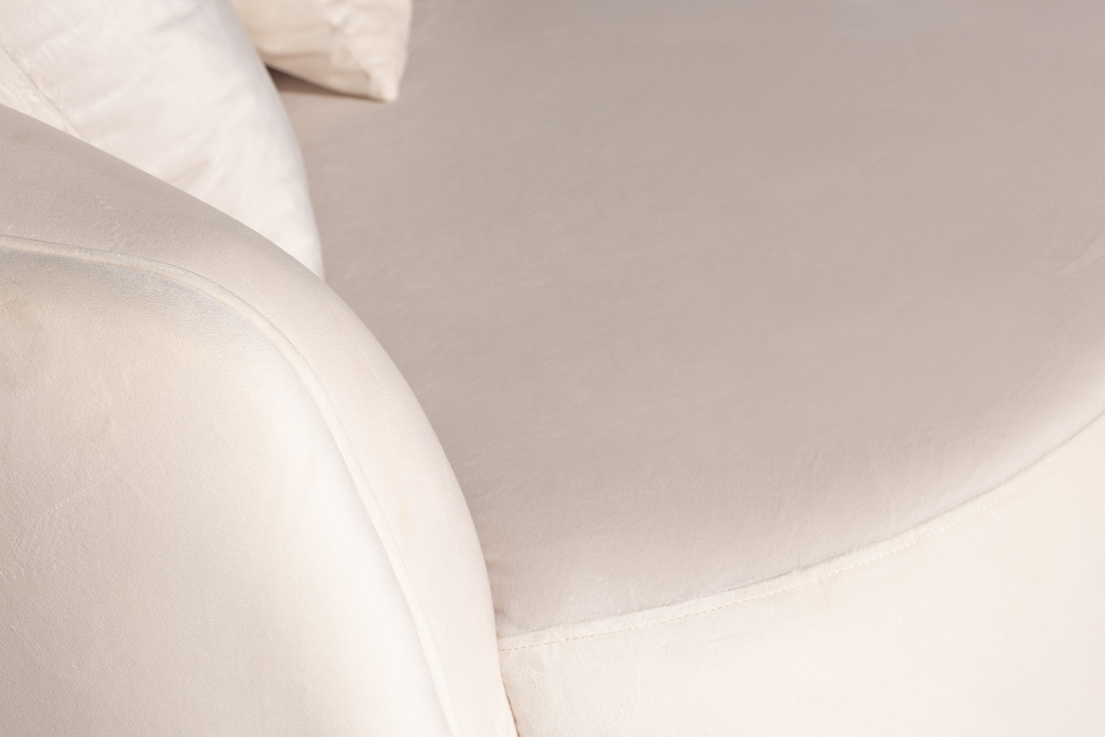 Велюровый диван с плавными формами приятного кремово-бежевого тона - настоящая жемчужина. В комплект входят четыре декоративные подушки 47*47см, две из них с вышивкой эмблема в цвет ткани.