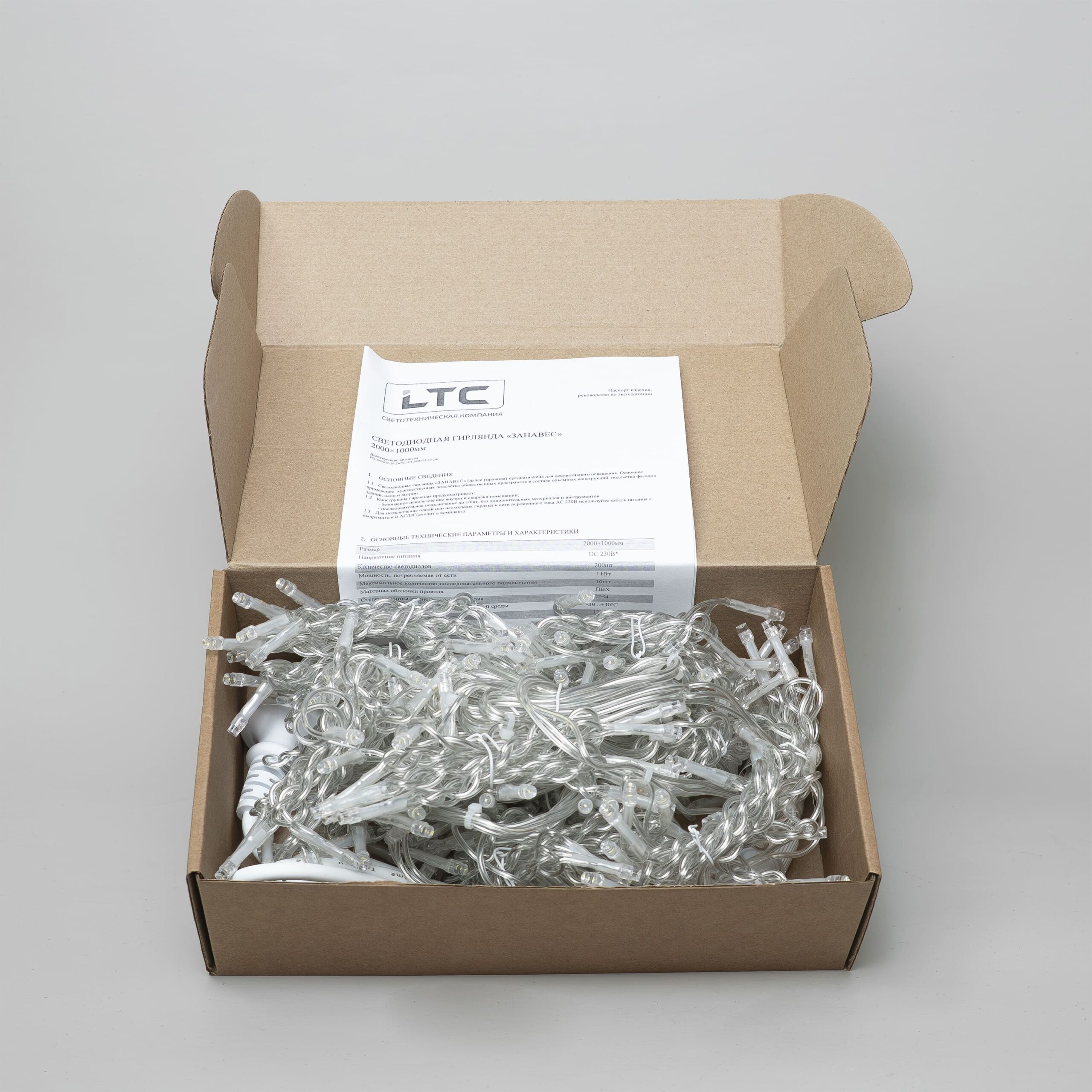 Гирлянда Занавес Облегченный 2 x 1 м Тепло-Белый 220В, 200 LED, Провод Прозрачный ПВХ, IP54 LTC PCL200NOT-10-2WW Абакан