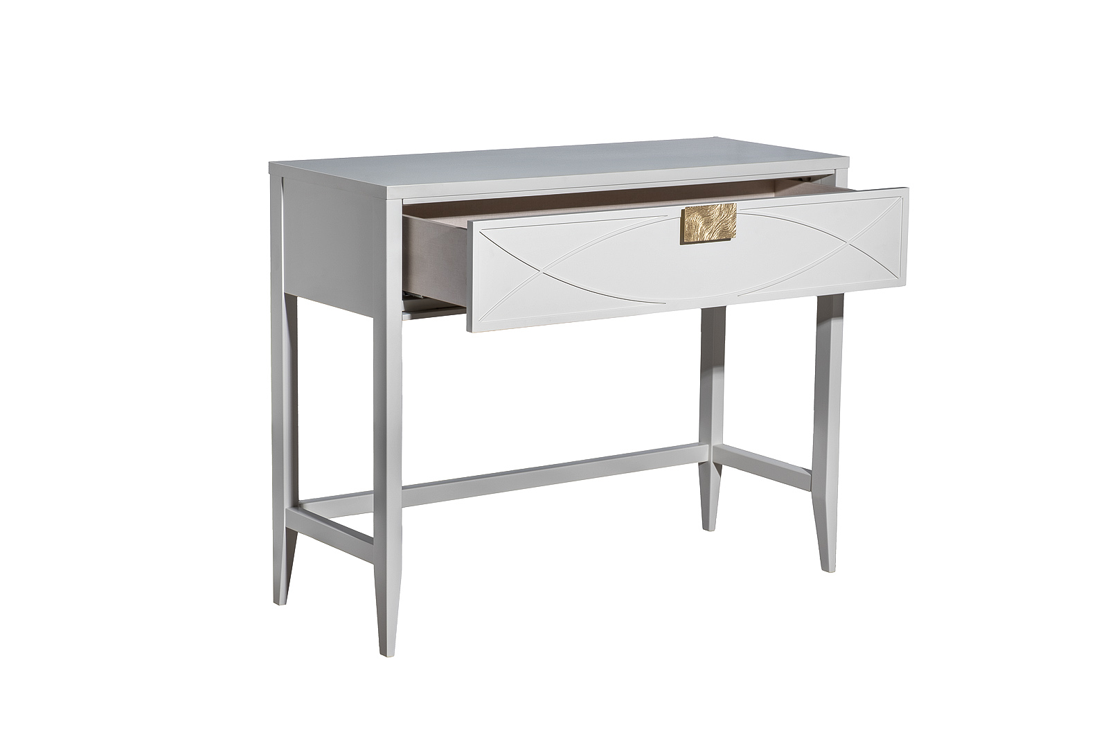 Дизайнерская консоль в стиле ар-деко - авторская разработка студии Garda Decor. Бежевый матовый фасад украшен объемным дугообразным декором и широкими рельефными ручками цвета матовое золото. Выдвижной ящик прекрасно подойдет для хранения щеток, косметики и прочих мелочей. Тонкие ножки придают конструкции легкость и изящество. Эксклюзивная консоль станет гармоничным дополнением интерьера прихожей, спальни или гостиной. На фото на сайте консоль представлена в комплектации с шкафом-витриной арт. 151SV-000016(шкаф-витрина открытый широкий). Консоль и витрина скрепляются между собой на саморезы(в комплекте).