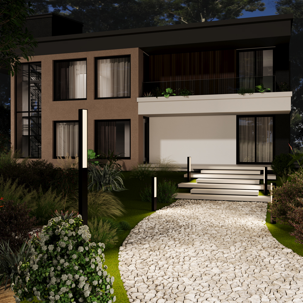 Материал арматуры — алюминий, цвет — графит. Рассеиватель из белого матового акрила — мягко рассеивает свет. Два размера — 1000 мм и 2500 мм. Мощность 20Вт и 40Вт для высокого светильника. LED-источник света. Цветовая температура 3000К. Защита корпуса от пыли и влаги — IP65. Подходят для основного освещения экстерьера.