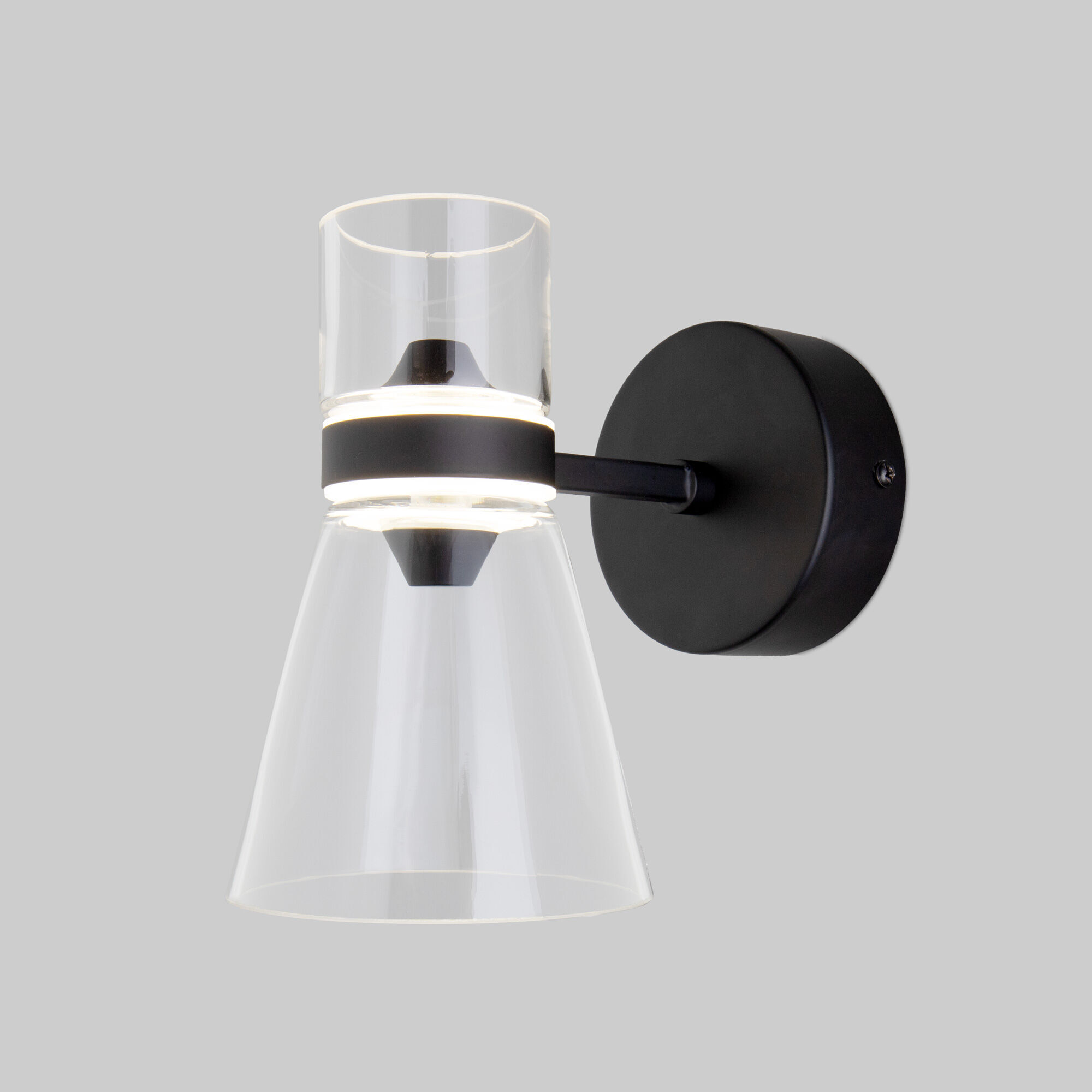 Прозрачный плафон в форме усеченного конуса позволяет свету мягко рассеиваться, создавая уютную и расслабляющую атмосферу. Черные элементы конструкции придают светильнику графичность и элегантность, делая его акцентным элементом любого пространства.