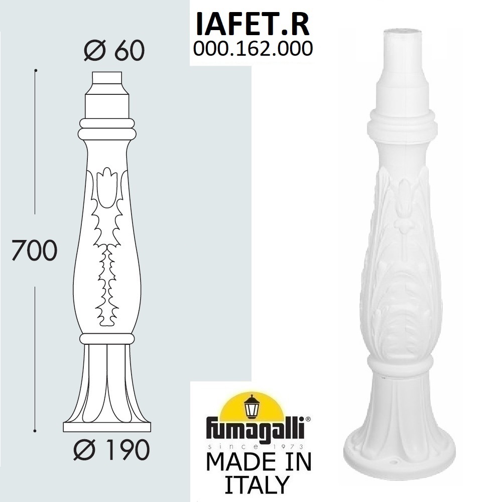 Парковый столб FUMAGALLI, модель IAFET. Опора наземная высотой 700 мм для светильника малого и среднего размера. Посадочный размер для фонарей равен 60мм.. Корпус изготовлен из современного вандалостойкого не горючего полимера RESIN. Прочного, окрашенного в массе, не ржавеющего и не выгорающего на солнце. Ножка и светильники не требуют заземления и относятся к 2 классу электробезопасности. Срок службы - не менее 20 лет. Температура использования от -60 до +90.