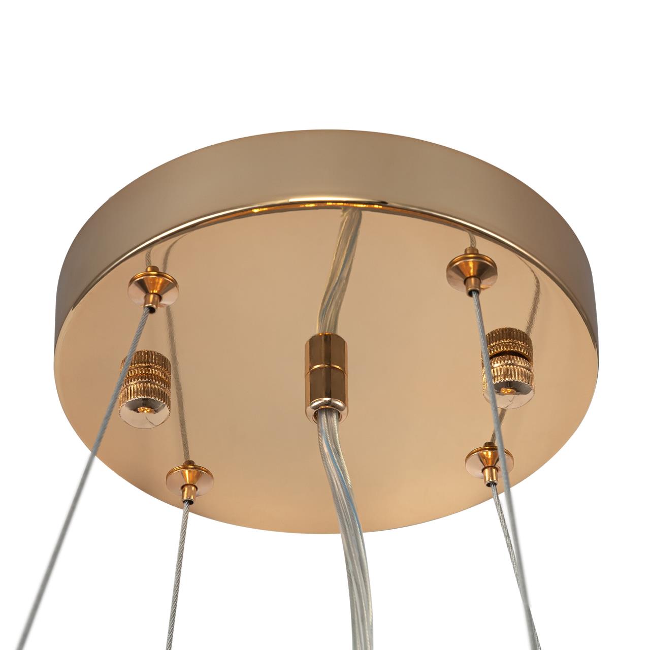 Каркас люстры — металлический, роскошного золотистого цвета. Силуэт составлен из множества тонких золотых колечек, внутри каждого из них закреплен кристаллик из прозрачного хрусталя. Тонкие подвесные тросы практически незаметны, создавая ощущение, что светильник парит в воздухе.