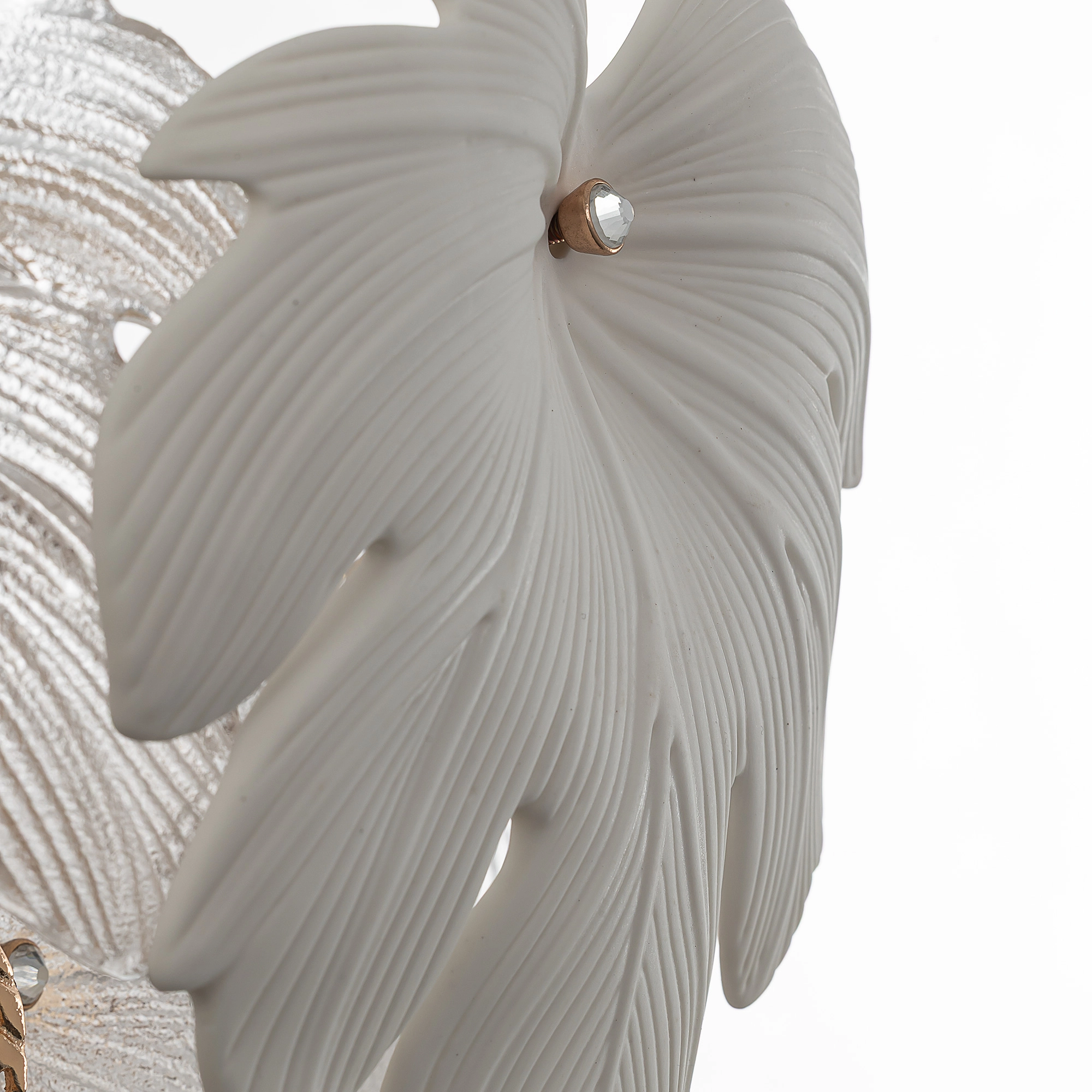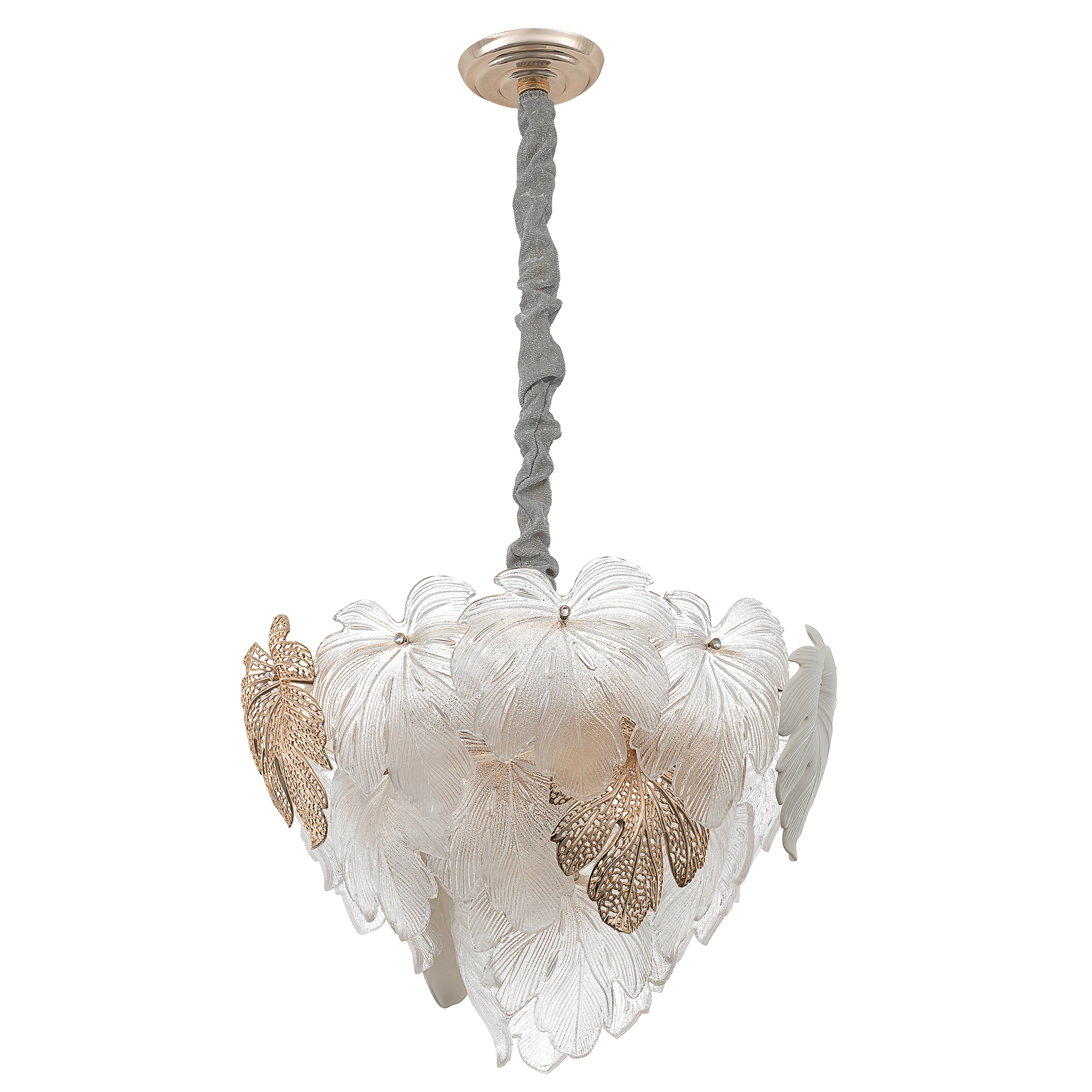 Металлический каркас благородного золотого оттенка дополняют изумительные стеклянные листья, которые формируют утонченный силуэт люстры. В люстре используются 11 лампочек с цоколем E14, максимальная мощность каждой — 60Вт для ламп накаливания. Высота люстры регулируется, ее можно установить на любой потолок, в том числе, и на натяжной.