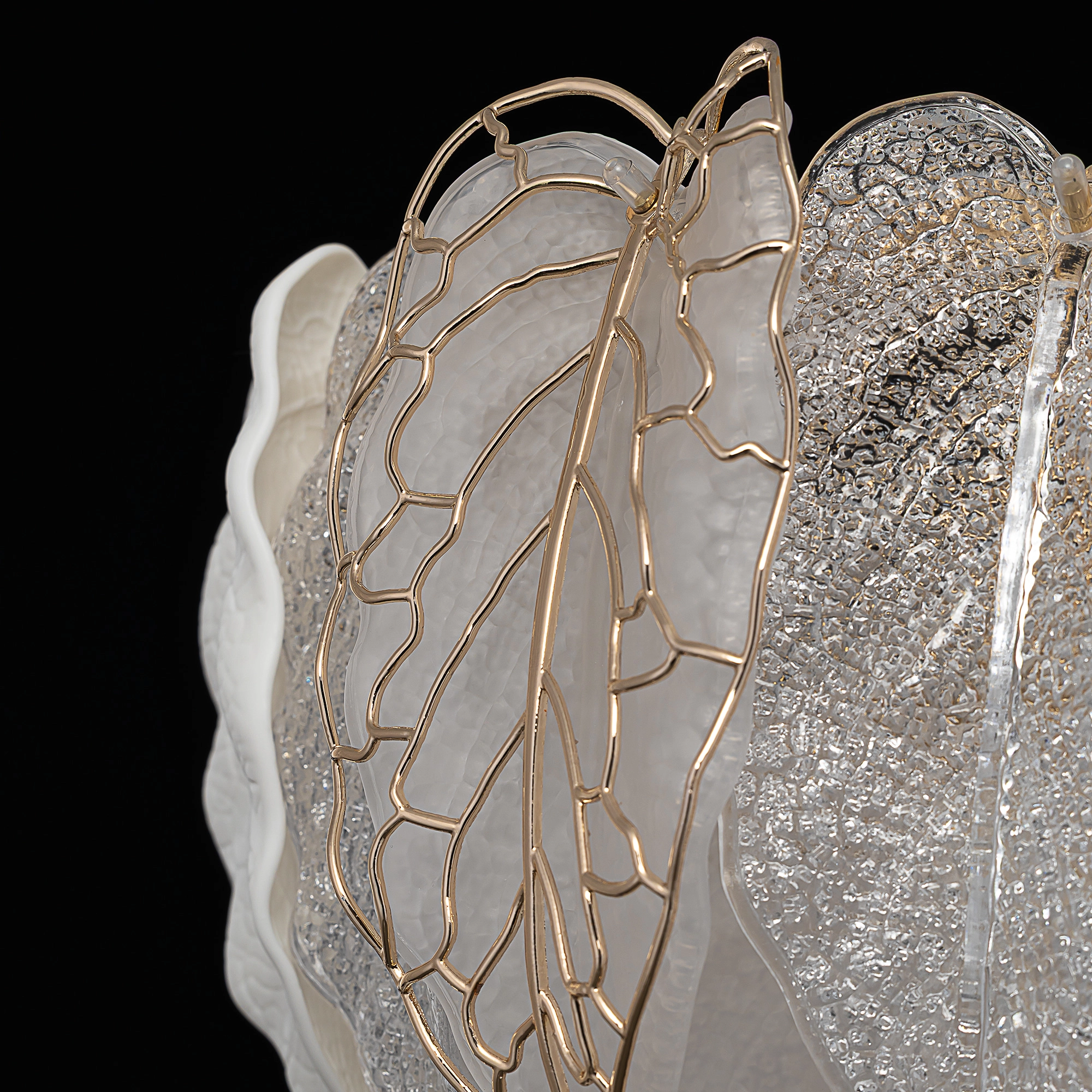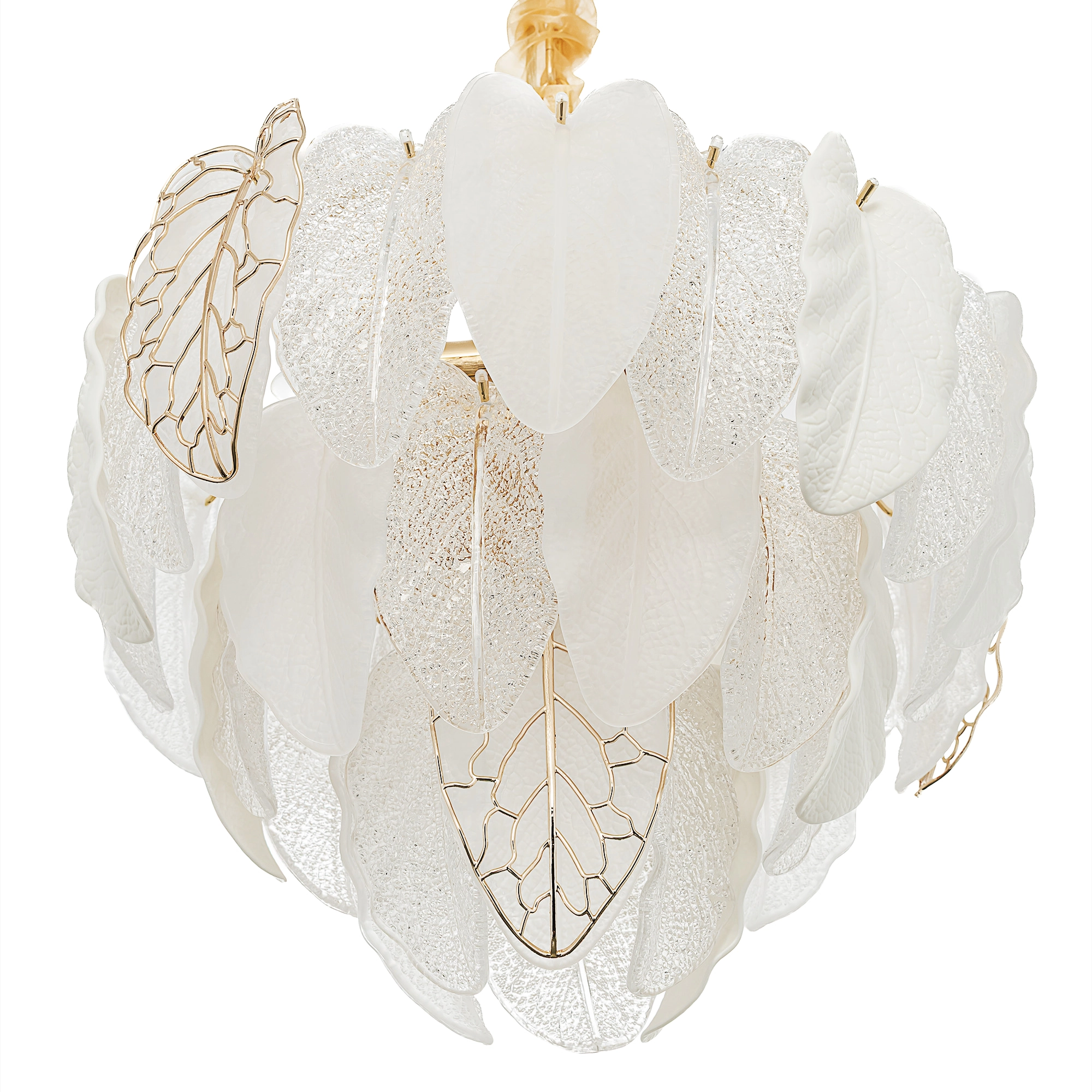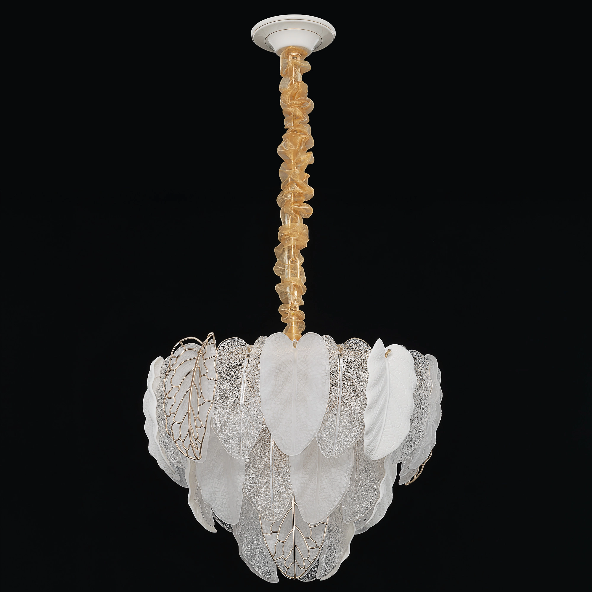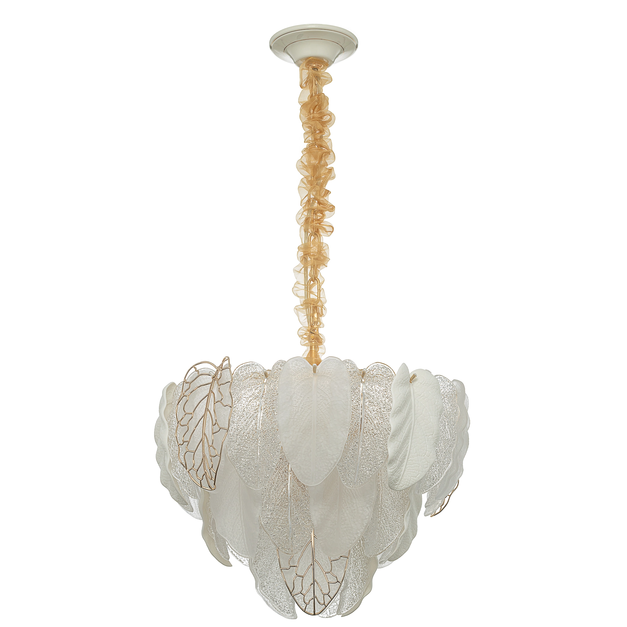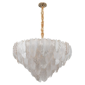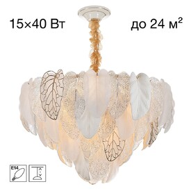 Белое керамическое основание, металлический каркас золотистого оттенка переливается в лучах света. Листья из полуматового и прозрачного рифленого стекла, белой керамики, а также металлические листья с прожилками, отлитые по ювелирной технологии, подчеркивают флористическую изысканность и четкость силуэта люстры. В изделии используются 10 лампочек с цоколем Е14, высоту подвесной цепи можно отрегулировать.