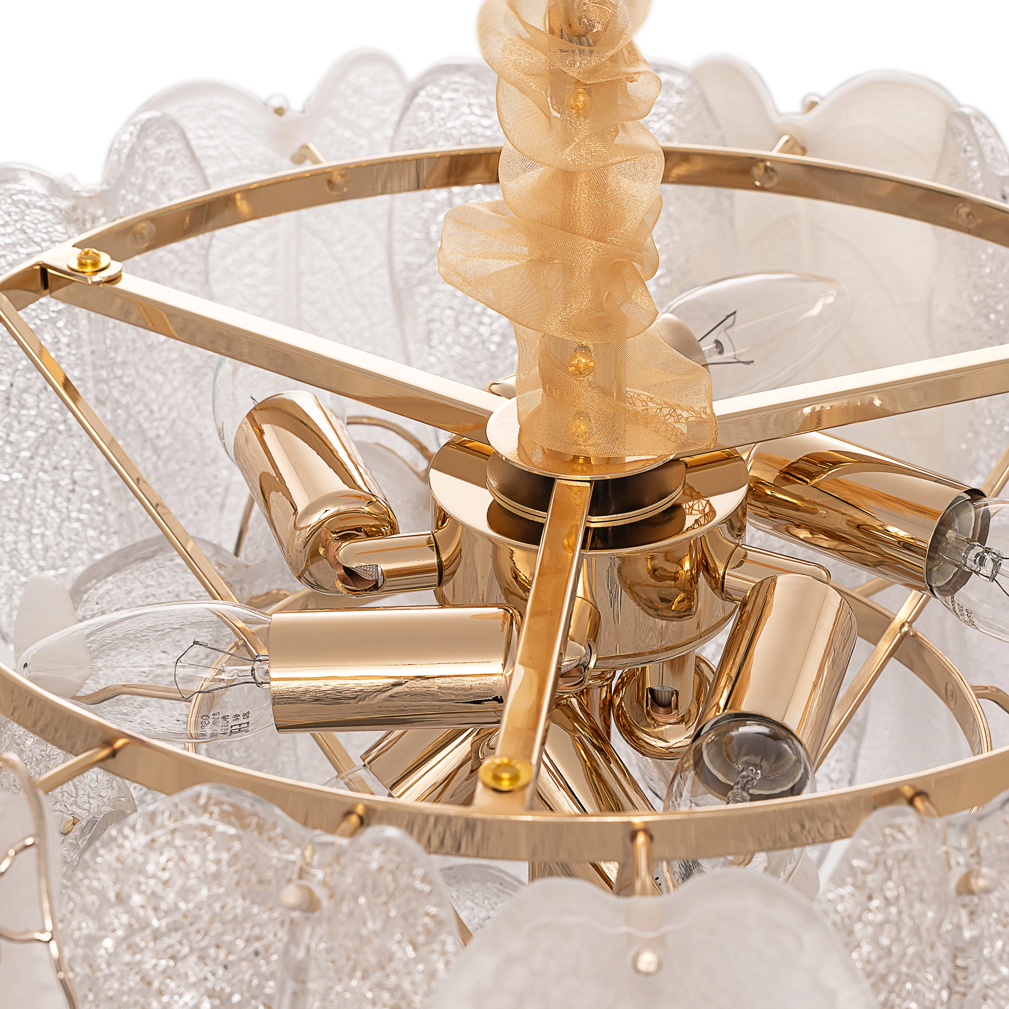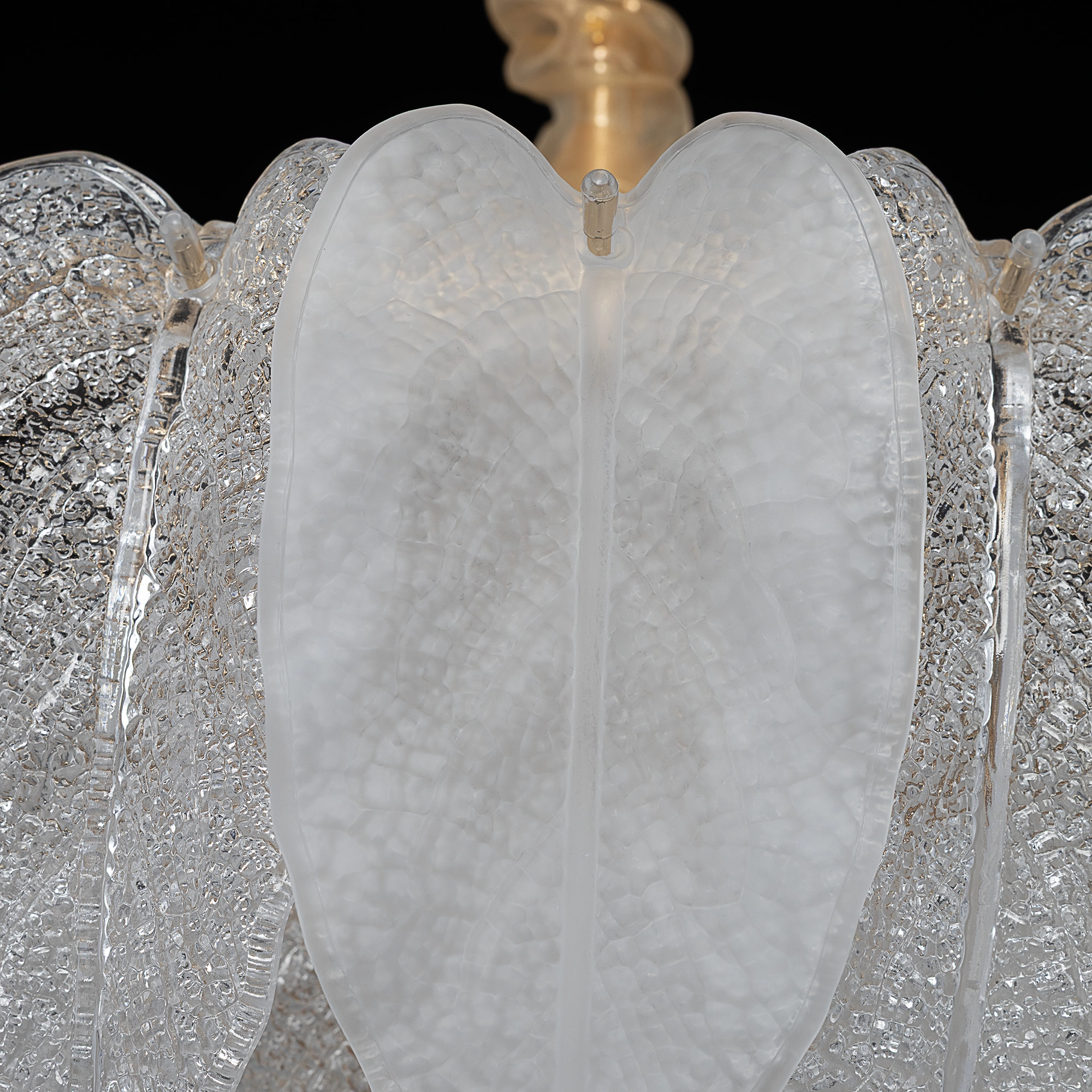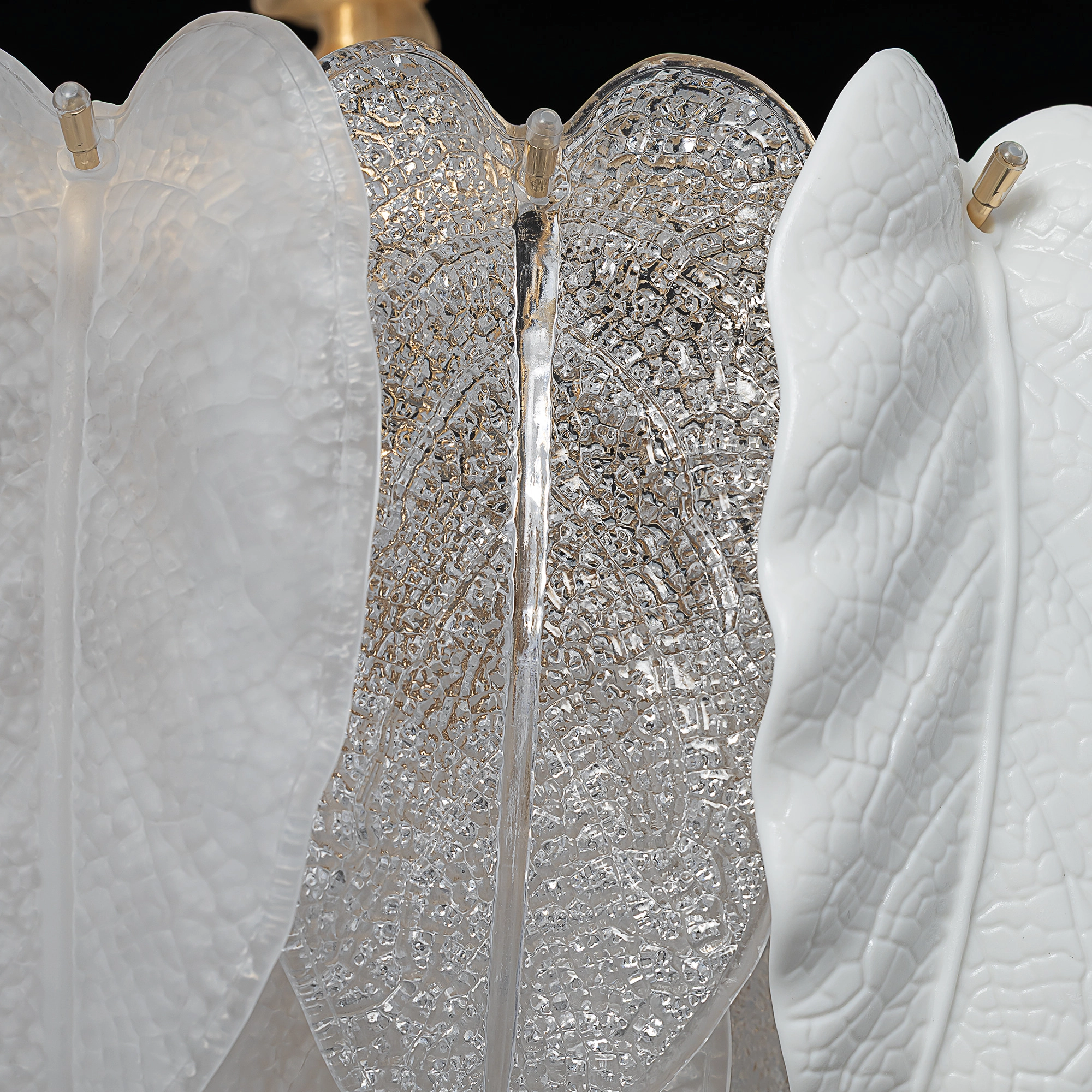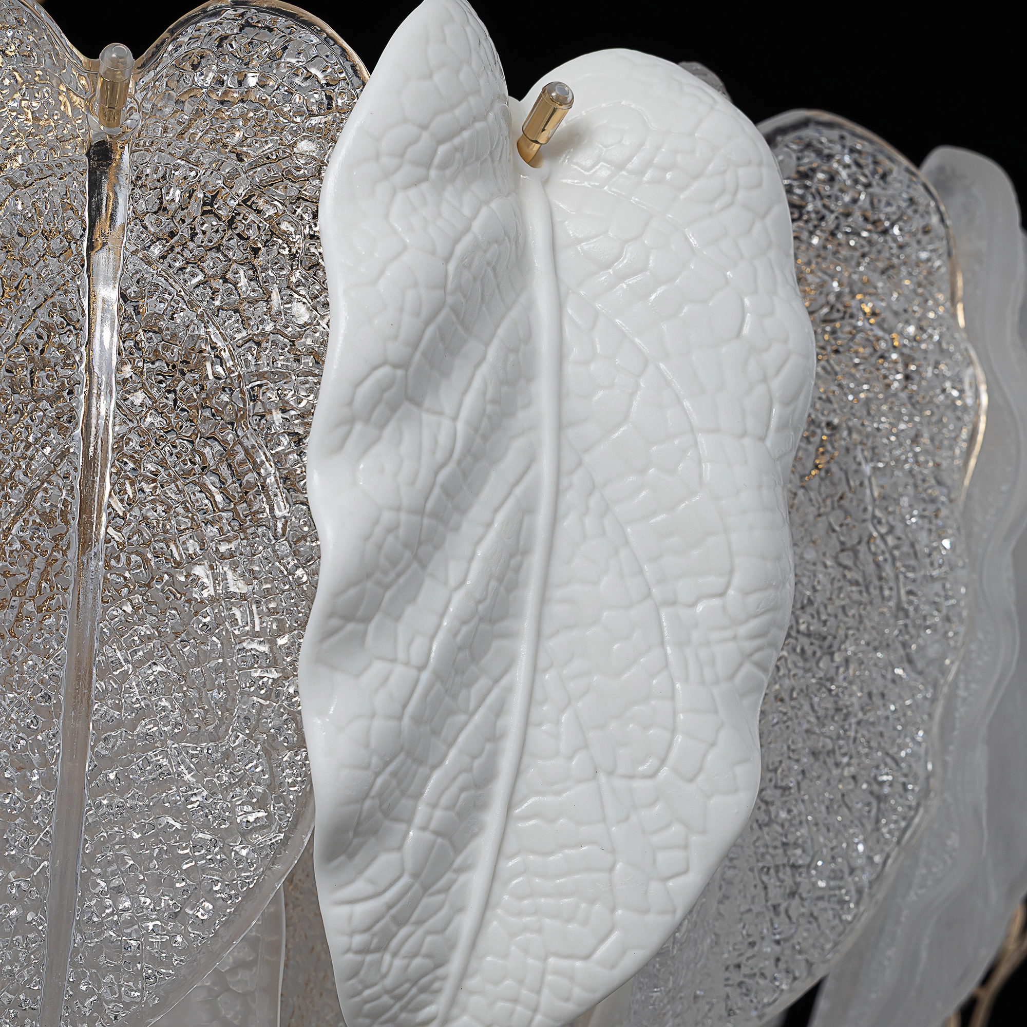 Белое керамическое основание, металлический каркас золотистого оттенка переливается в лучах света. Листья из полуматового и прозрачного рифленого стекла, белой керамики, а также металлические листья с прожилками, отлитые по ювелирной технологии, подчеркивают флористическую изысканность и четкость силуэта люстры. В изделии используются 10 лампочек с цоколем Е14, высоту подвесной цепи можно отрегулировать.