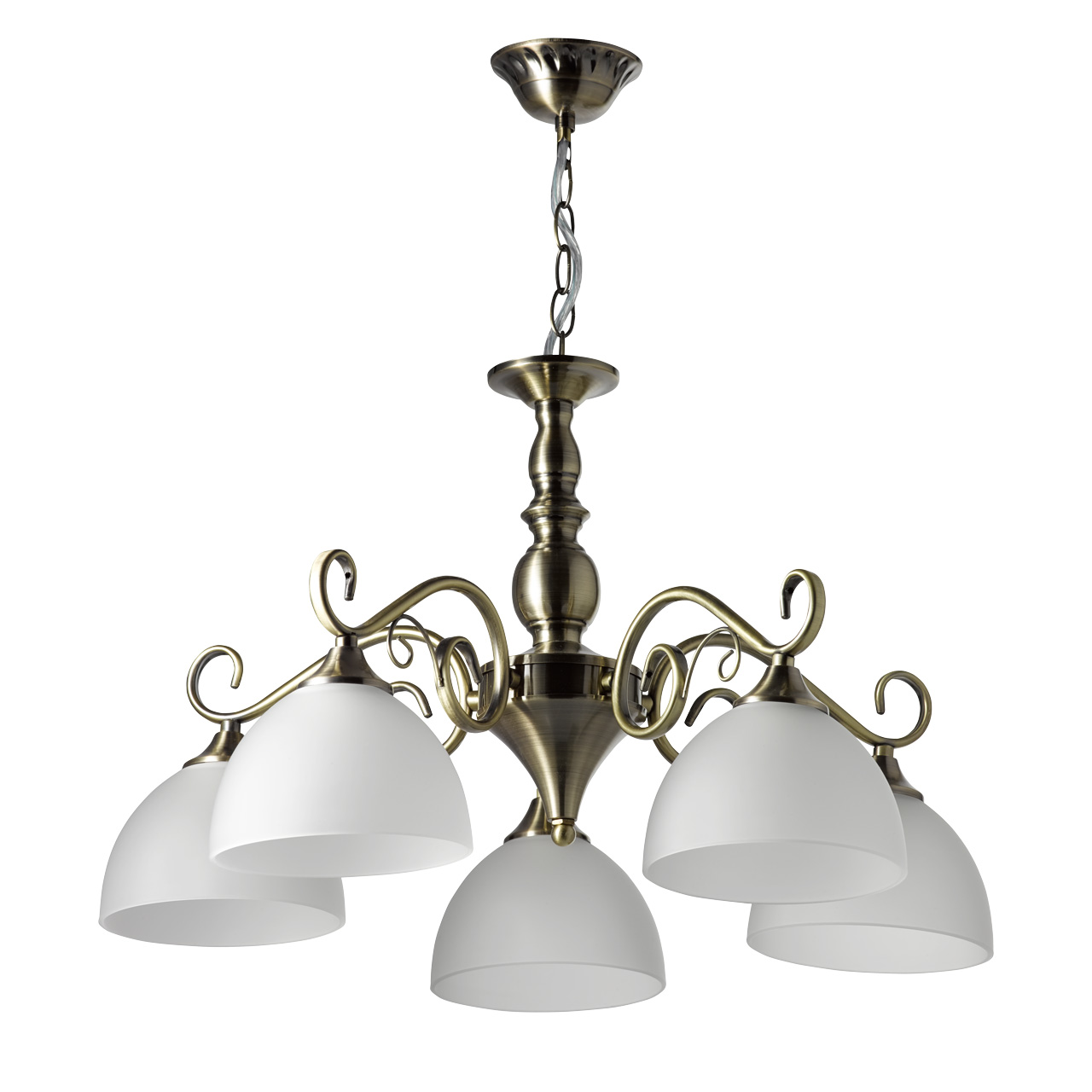 Потолочная люстра станет украшением спальни, кухни или гостиной среднего размера. Плафоны светильника направлены вертикально вниз, поэтому световой поток концентрируется преимущественно в центре комнаты. Для точечного освещения других функциональных зон можно использовать настенные светильники с идентичным оформлением.
