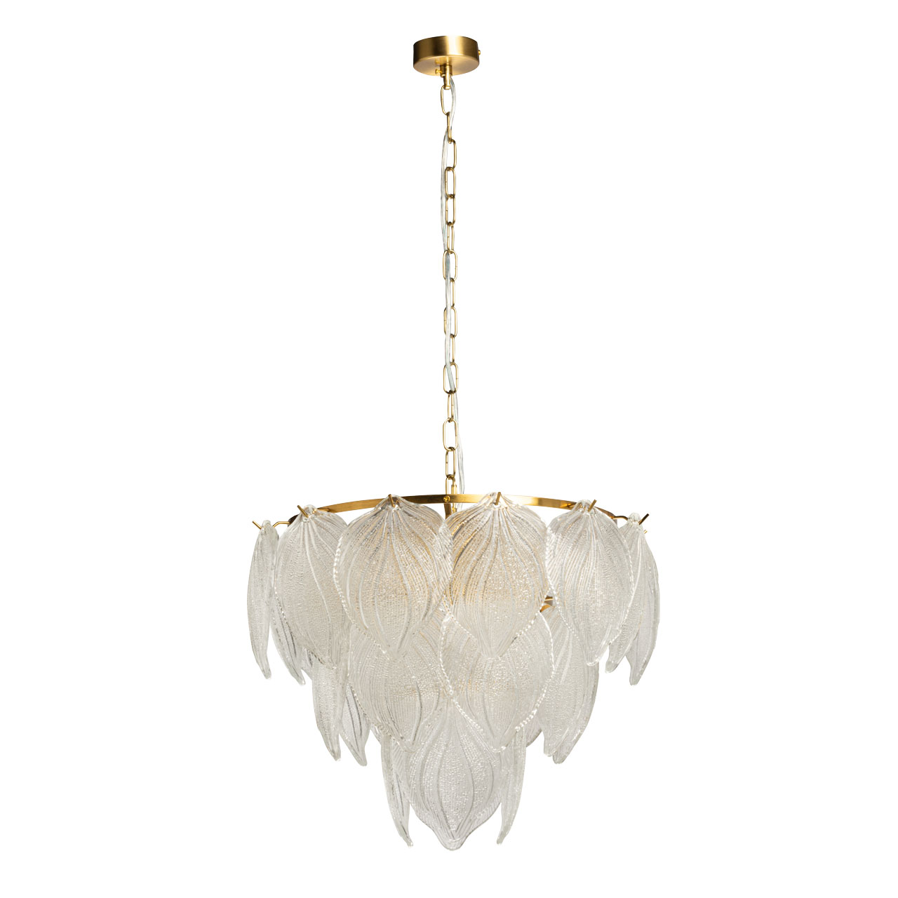 Металлическое основание подвесной люстры гальванизировано в цвет латуни. Светильник декорирован белыми стеклянными пластинами в форме листьев.