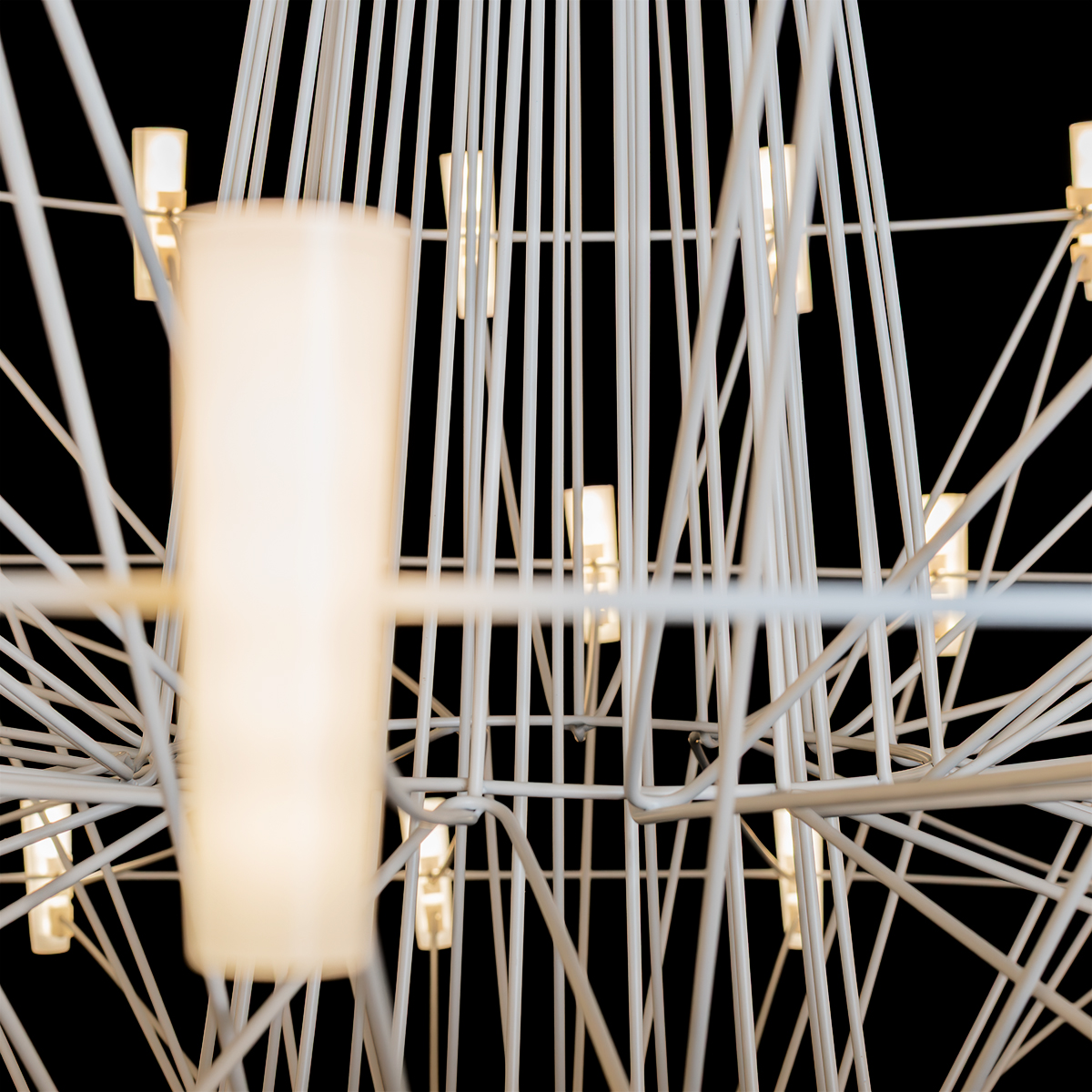 Белые цилиндрические плафоны расположены на концах спиц, создавая живой ритм и ощущение динамики, словно свет в любой момент может расплескаться по комнате. Благодаря такому расположению свет мягко раскрывается по всему периметру, подчеркивая архитектуру помещения и создавая уютную атмосферу без резких акцентов.