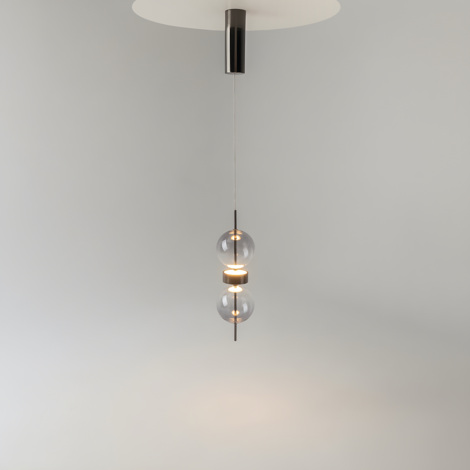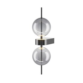 Серия включает подвесной светильник, бра, напольный и портативную модели. Стеклянные плафоны с зеркальным градиентом, черная глянцевая арматура из металла. LED-источник (3000K) скрыт матовым рассеивателем. Конструктивные особенности: магнитные потолочные чаши у подвесов и магнитное основание у бра обеспечивают монтаж без видимого крепежа. Напольный и аккумуляторный светильники диммируются при длительном удержании кнопки. Серия отмечена премиями Red Dot и A’design за инновационный дизайн.