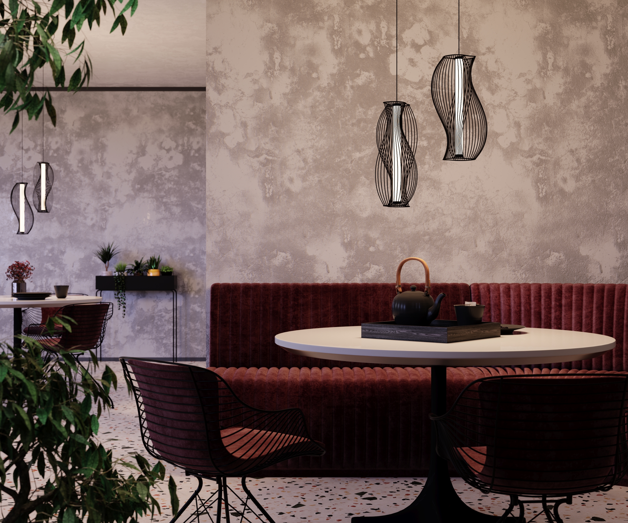 Два цветовых решения: черный и латунь. Абажуры из проволоки в асимметричном исполнении. Оригинальный дизайн, вдохновленный силуэтами античных амфор. Центральный LED-источник света с матовым рассеивателем. Регулируемая высота подвеса и провод длиной 3 метра. Возможность создания композиций.