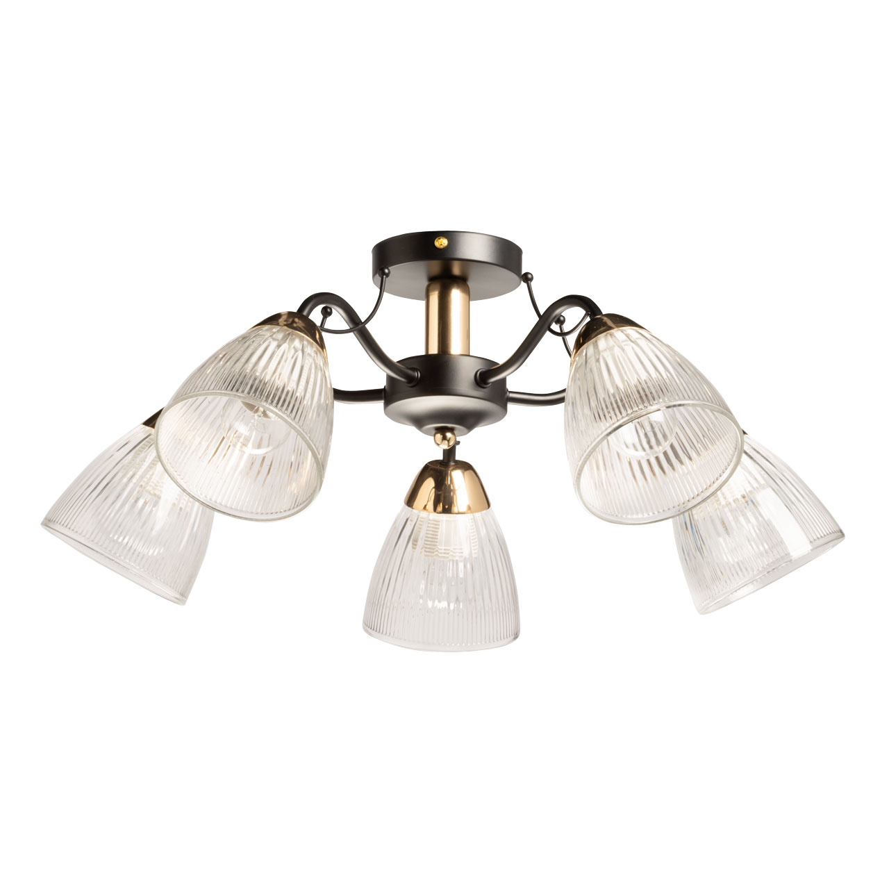 Металлическое основание потолочной люстры окрашено в черный цвет. Отдельные элементы основания гальванизированы в цвет французского золота. Люстра декорирована плафонами из прозрачного фактурного стекла.