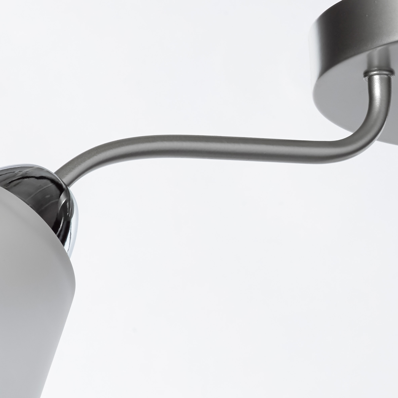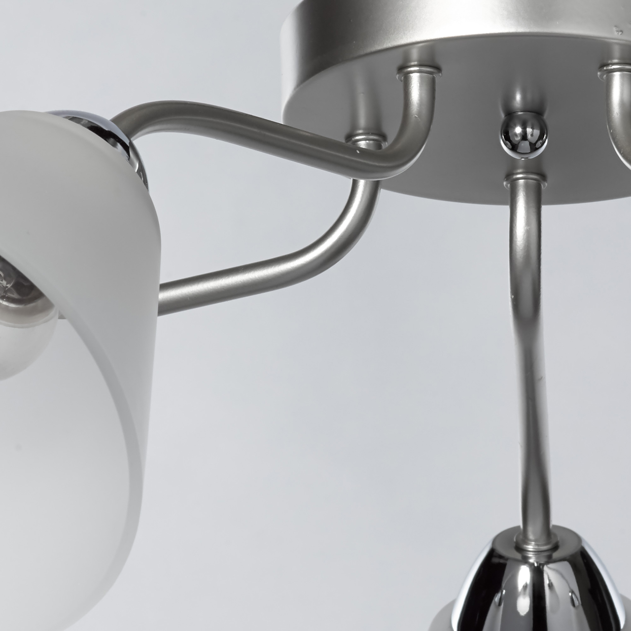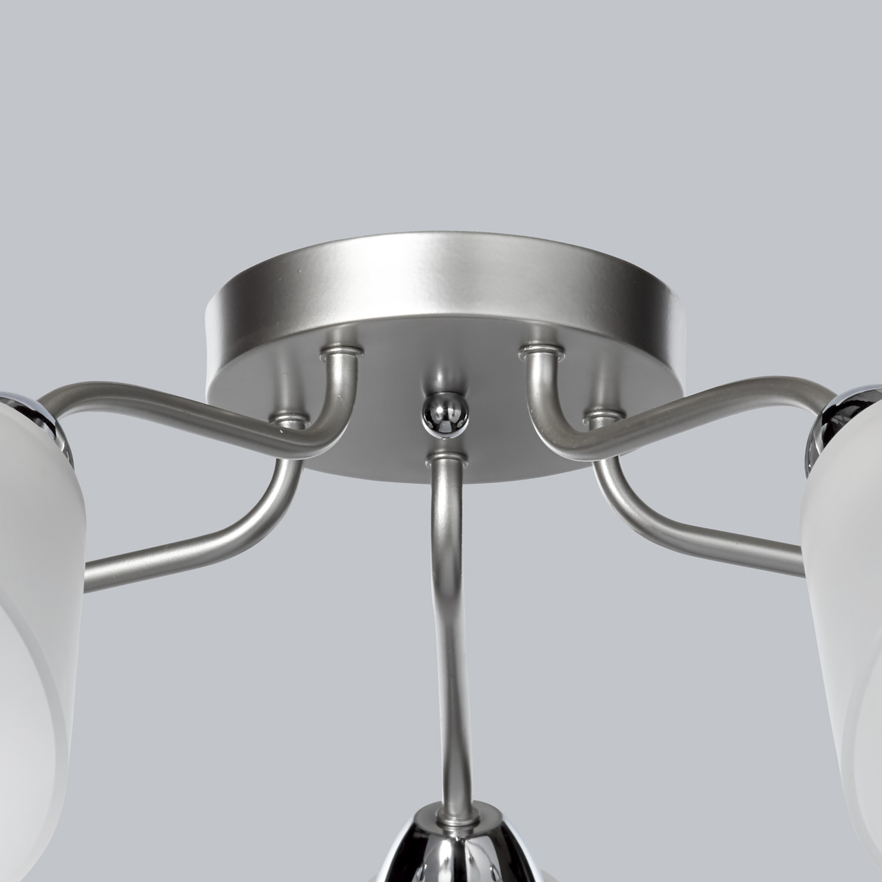 Основание светильника выполнено из металла и окрашено в цвет перламутрового серебра. Отдельные элементы основания гальванизированы в цвет хрома. Светильник декорирован стеклянными матированными плафонами.