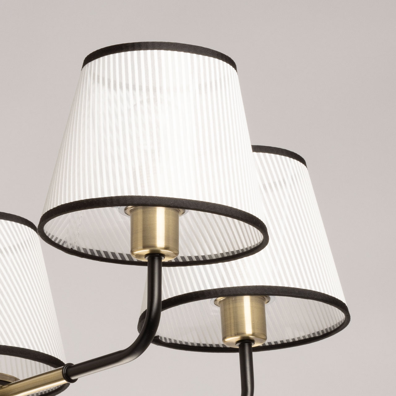 Основание светильника выполнено из металла и окрашено в черный цвет, отдельные элементы гальванизированы в цвет античной бронзы. Белые тканевые абажуры украшены линейным рисунком и имеют внутри термостойкий акрил. Края абажуров отделаны черным кантом и прошиты.