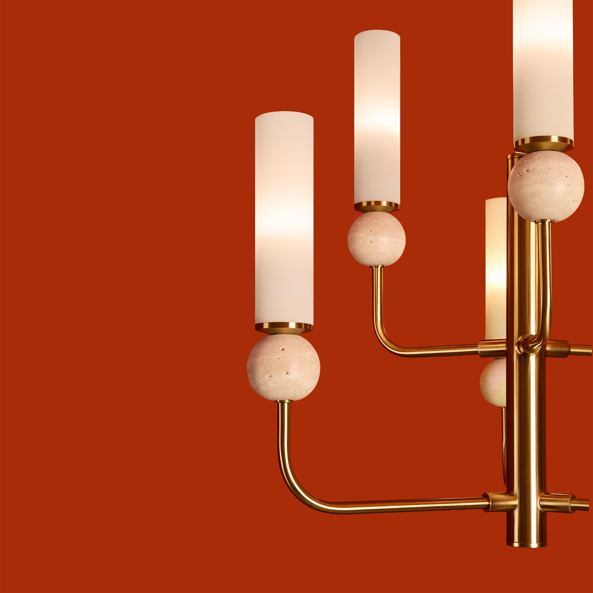 Серия Sunspot использует камень травертин как основной декоративный элемент. Настенные бра в двух вариантах: с матовым белым стеклянным плафоном и со «скользящим» теплым светом. Отличительная черта бра: увеличенный размер плафона и сенсорное включение/выключение без диммирования. Подвесные светильники имеют прозрачные стеклянные плафоны с декоративными шариками из камня травертин. Sunspot включают три модели подвесов разных размеров и форм стеклянной окантовки на плафон. Арматура — металл латунного и черного цвета Источники света LED 3000K и цоколь G9. Настольная лампа с touch переключателем . Серия создает комплексное зональное и акцентное освещение, подходящее для создания уютной атмосферы.