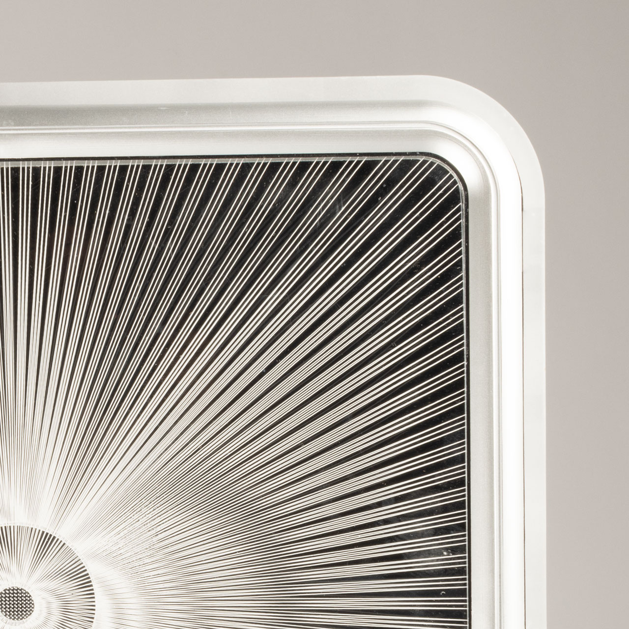 Металлическое основание светильника окрашено в белый цвет. Плафон выполнен из сплава алюминия с цинком и окрашен серый цвет. Светодиодные источники света закрыты белым матовым акрилом. Потолочная люстра декорирована металлической пластиной, гальванизированной в цвет хрома и прозрачным акрилом с 3D-эффектом.