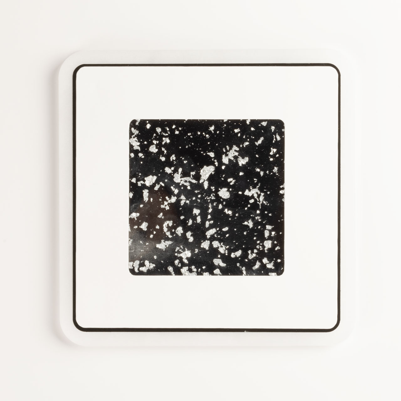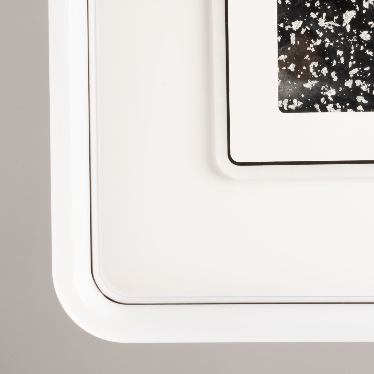 Металлическое основание потолочной люстры окрашено в белый цвет. Корпус плафона выполнен из сплава алюминия с цинком и окрашен в черный цвет. Светодиодные источники света закрыты матовым акрилом. Светильник декорирован пластиной, окрашенной в белый цвет с черным кантом, в центре пластины находится область с эффектом фольгирования цвета серебро.