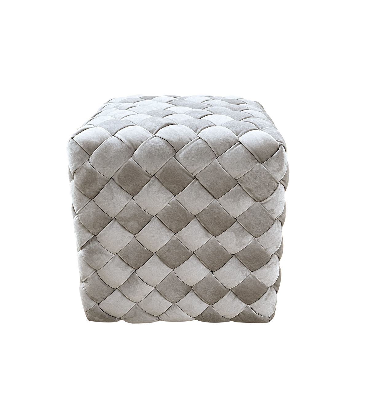 Необычный пуфик с интересной отделкой сиденья из плетеных лент ткани с наполнителем ППУ внутри в ромбическом узоре. Нейтральный серо-бежевый цвет велюра и компактность дают возможность вписать такой предмет мебели в разнообразные варианты интерьера.