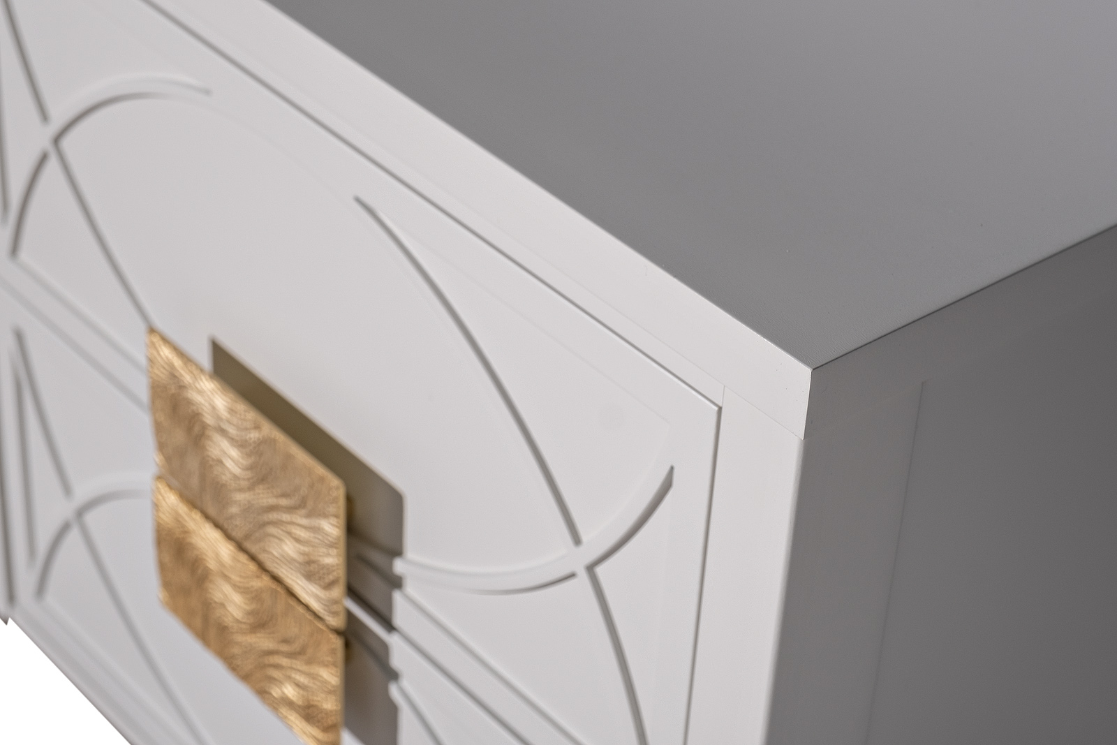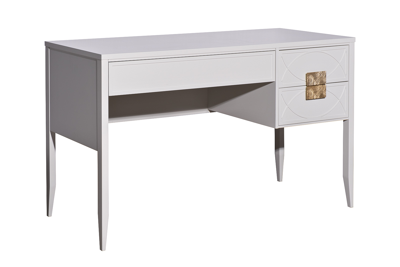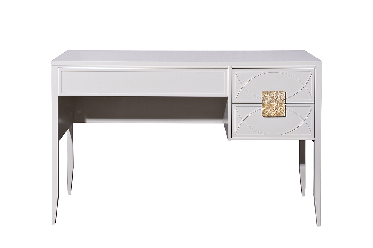 Дизайнерский письменный стол в стиле ар-деко - авторская разработка студии Garda Decor. Бежевый матовый фасад украшен объемным дугообразным декором и широкими рельефными ручками золотого цвета (матовое золото). Тонкие ножки придают конструкции легкость и изящество. Эксклюзивный письменный стол станет гармоничным дополнением интерьера спальни, гостиной или кабинета. Выдвижные ящики расположены справа стола.