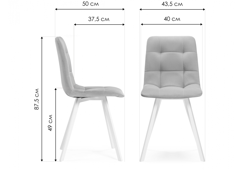 Материал каркаса - металл; Материал сиденья - велюр; Материал обивки - велюр; Цвет ножек - черный; Ширина - 43,5; Глубина - 50; Высота - 87,5; Ширина сиденья - 40; Глубина сиденья - 37,5; Высота сиденья - 49;