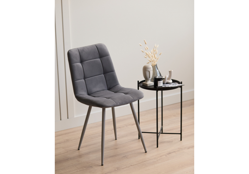 Материал каркаса - металл; Материал сиденья - велюр; Материал обивки - велюр; Цвет ножек - серый; Ширина - 43,5; Глубина - 50; Высота - 87,5; Ширина сиденья - 40; Глубина сиденья - 37,5; Высота сиденья - 49;