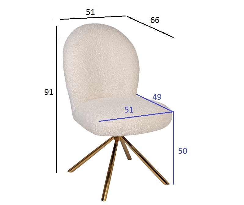 Оригинальный обеденный стул с вращающимся сиденьем и стильной обивкой из белоснежного букле. Современный дизайн встречается с классическим комфортом в этом стуле. Сочетание обтекаемых линий, мягкой обивки и блестящего каркаса придает ему особый шарм. Мягкая обивка из белоснежного букле создает ощущение невесомости и уюта, словно вы парите в облаке. Элегантный золотистый каркас придает стулу изысканность и роскошный вид, а вращающийся механизм добавляет функциональности. Этот стул станет идеальным дополнением для любой современной гостиной или стильной кухни. Обеденный стул с обивкой из белой ткани букле. Основание – сталь цвета брашированное золото с поворотно-возвратным механизмом. После поворота пружина плавно возвращает сиденье со спинкой в исходное положение.