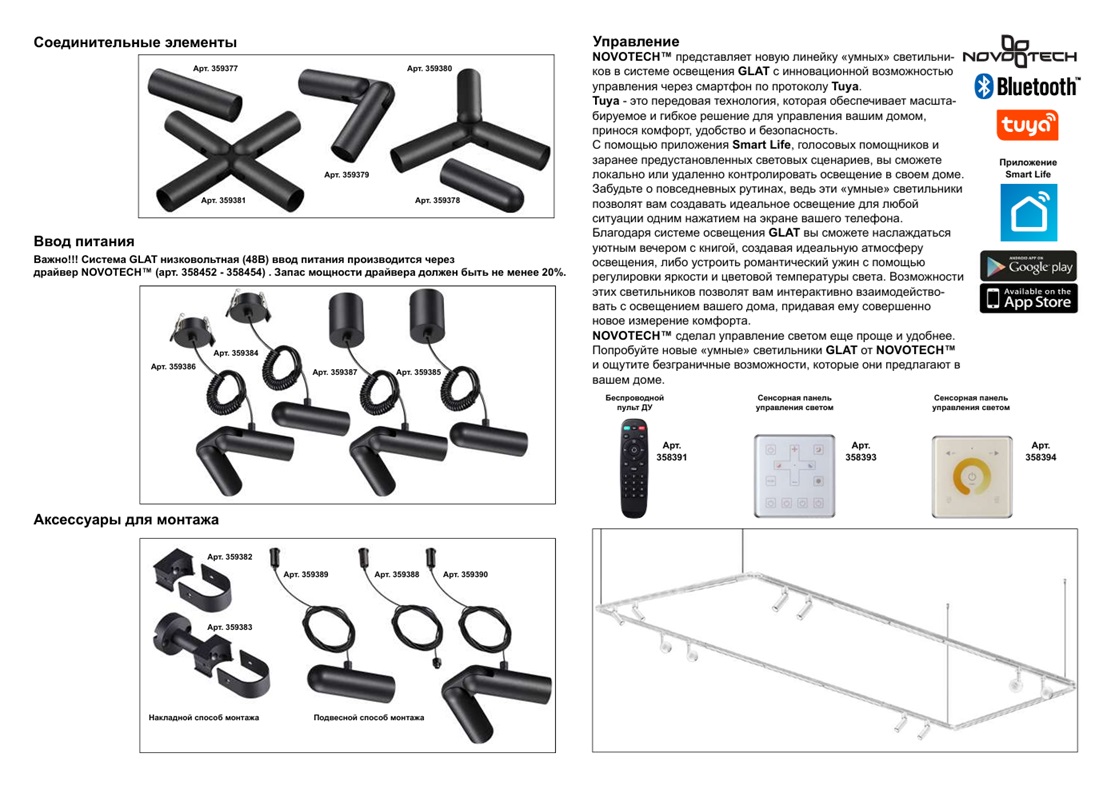 Светильник диммируемый светодиодный с пультом ДУ Novotech GLAT 359371 — это модель, которая является частью модульной системы GLAT, представляющей собой комплект из низковольтных светодиодных «умных» светильников (арт. 359362 - 359376), соединительных элементов (арт. 359377 - 359383) и различных баз для ввода питания (арт. 359384 - 359387). Благодаря источнику света с типом цоколя LED и мощностью 24 Вт, а также с цветовой температурой 3000 К-6000 К, этот осветительный прибор обеспечивает комфортное и равномерное освещение на площади в 10 квадратных метров, создавая уютную атмосферу в вашем доме. Световой поток равен 1920 Лм. Алюминиевый корпус в черном цвете и белый пластиковый плафон в форме цилиндра придают светильнику современный и стильный вид. Размеры устройства составляют 28 мм х 1040 мм, что позволяет легко интегрировать его в любое интерьерное пространство. Технической особенностью является большой угол рассеивания света -110 градусов и высокая цветопередача >90 CRI. Модели, входящие в коллекцию GLAT, идеально подойдут для размещения в зоне гостиной, спальни, кабинета или офиса, оформленных в стиле Техно или Хай-тек. Особенностью системы GLAT является использование безопасного питания постоянным током с напряжением 48В. Для обеспечения оптимальной работы системы рекомендуется использование выносных драйверов NOVOTECН. В наличии имеются три модели драйверов с различной мощностью: арт. 358452–100Вт, арт. 358453–150Вт и арт. 358454–200Вт. Расчет мощности драйвера осуществляется на основе суммарной мощности всех светильников в системе, увеличенной на 20%. Такой подход позволяет обеспечить достаточный запас мощности и защитить систему от перегрузок. Относительно способа монтажа, модульная система GLAT предлагает два варианта: накладной и подвесной монтаж. Выбор способа зависит от конкретных условий помещения и предпочтений пользователя, тем самым у вас есть возможность создать свой собственный сценарий освещения пространства. Управление светильниками происходит с помощью пульта ДУ, а также с инновационной возможностью управления через смартфон по протоколу Tuya или с Яндекс Алисой. Tuya - это передовая технология, которая обеспечивает масштабируемое и гибкое решение для управления вашим домом, принося комфорт, удобство и безопасность. С помощью приложения Smart Life, голосовых помощников и заранее предустановленных световых сценариев, вы сможете локально или удаленно контролировать освещение в своем доме. Забудьте о повседневных рутинах, ведь эти «умные» светильники позволят вам создавать идеальное освещение для любой ситуации одним нажатием на экране вашего телефона. Светильник диммируемый светодиодный с пультом ДУ Novotech GLAT 359371 — это надёжный и долговечный осветительный прибор от венгерского производителя, который позволит вам интерактивно взаимодействовать с освещением вашего дома, придавая ему совершенно новое измерение комфорта. Данную модель 359371 спешите купить с быстрой доставкой в магазине 220svet.ru