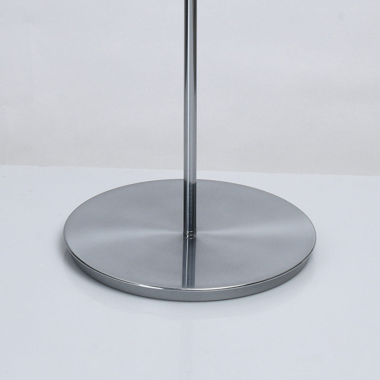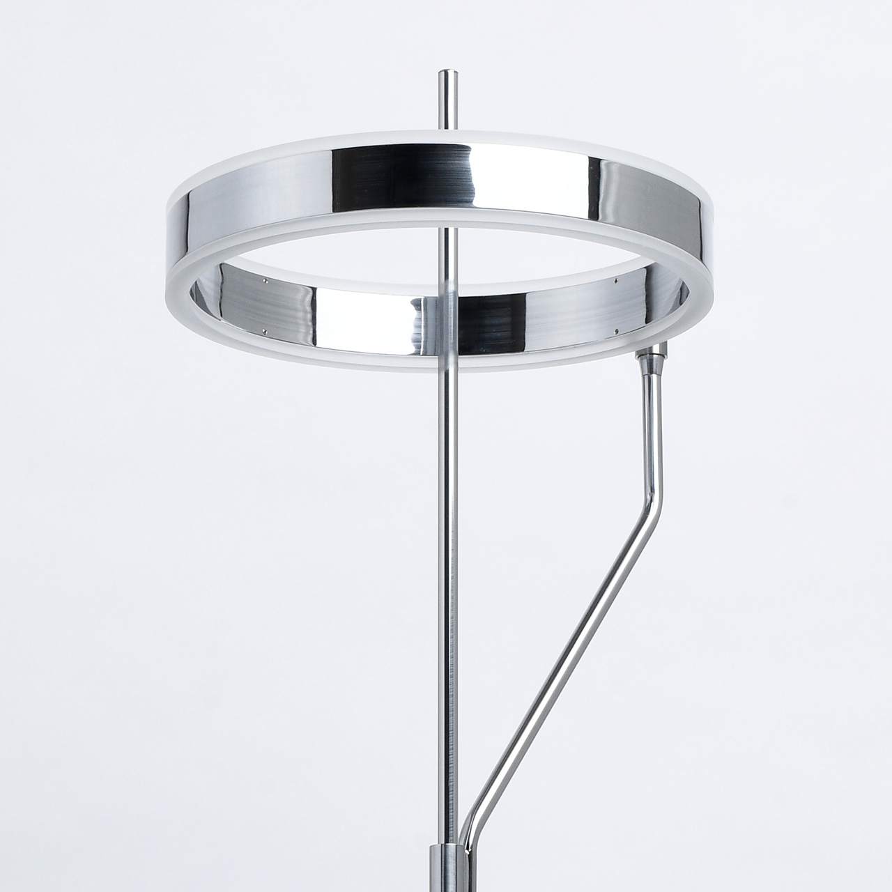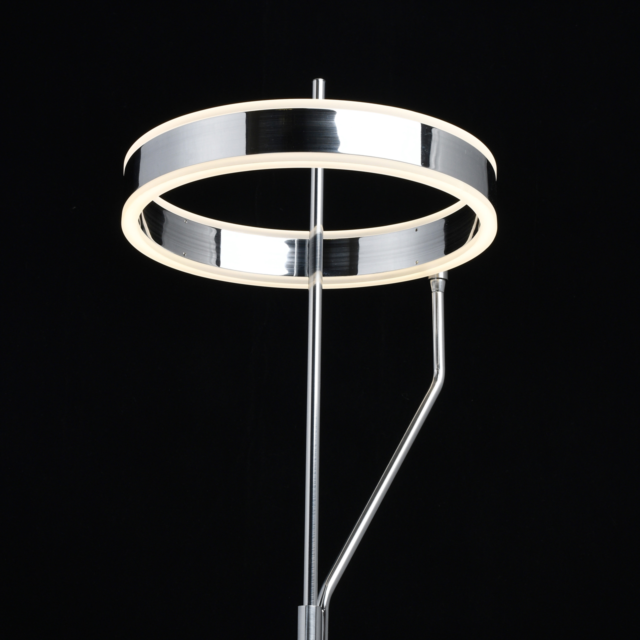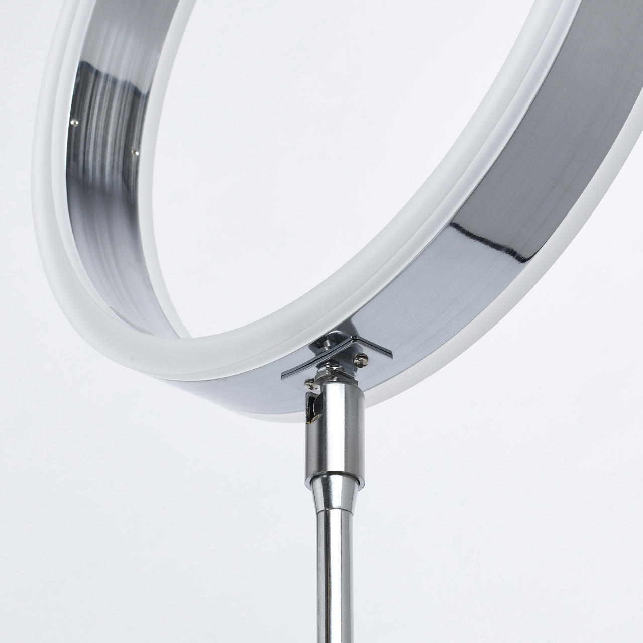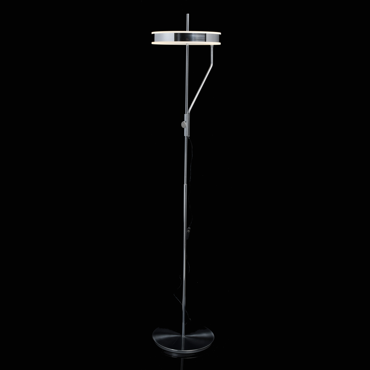 Основание светильника выполнено из металла и гальванизировано в цвет хрома. Плафон выполнен из сплава алюминия, обработан по технологии брашинга и гальванизирован в цвет основания. Светодиодный источник света типа SMD Strip закрыт белым матовым акрилом.