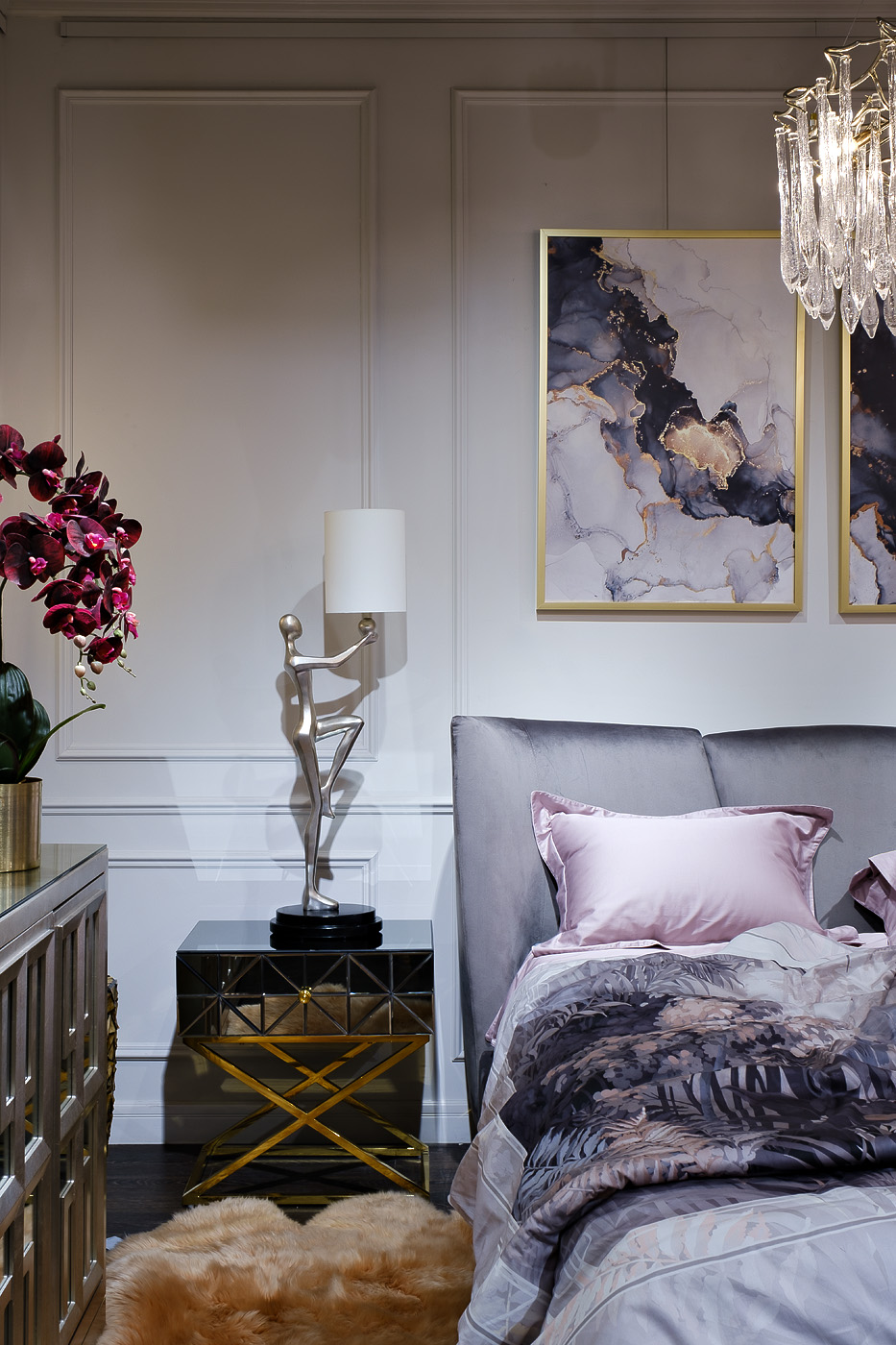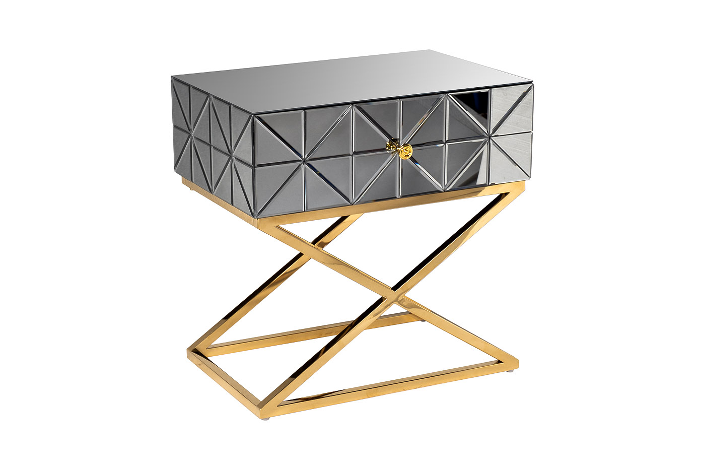 Неординарная тумбочка с выдвижным ящиком дополнит оригинальный интерьер спальни. Поверхность ее фасада собрана из небольших треугольных зеркал, что создает космическое впечатление. Мебель имеет основу из нержавеющей стали цвета золота. Скрещенные ножки гармонично дополняют дизайн зеркальной тумбочки, обеспечивая устойчивость. Представленная модель прекрасно подойдет для интерьера спальни в стиле неоклассики, арт-деко или фьюжн. Тумбочки компактны, поэтому даже в паре не займут много места. А вместительный ящик позволит хранить в нем все, что должно быть под рукой. Тумбу гармонично дополнят консоль арт. KFG113 и комод арт. KFG126 из этой же коллекции.
